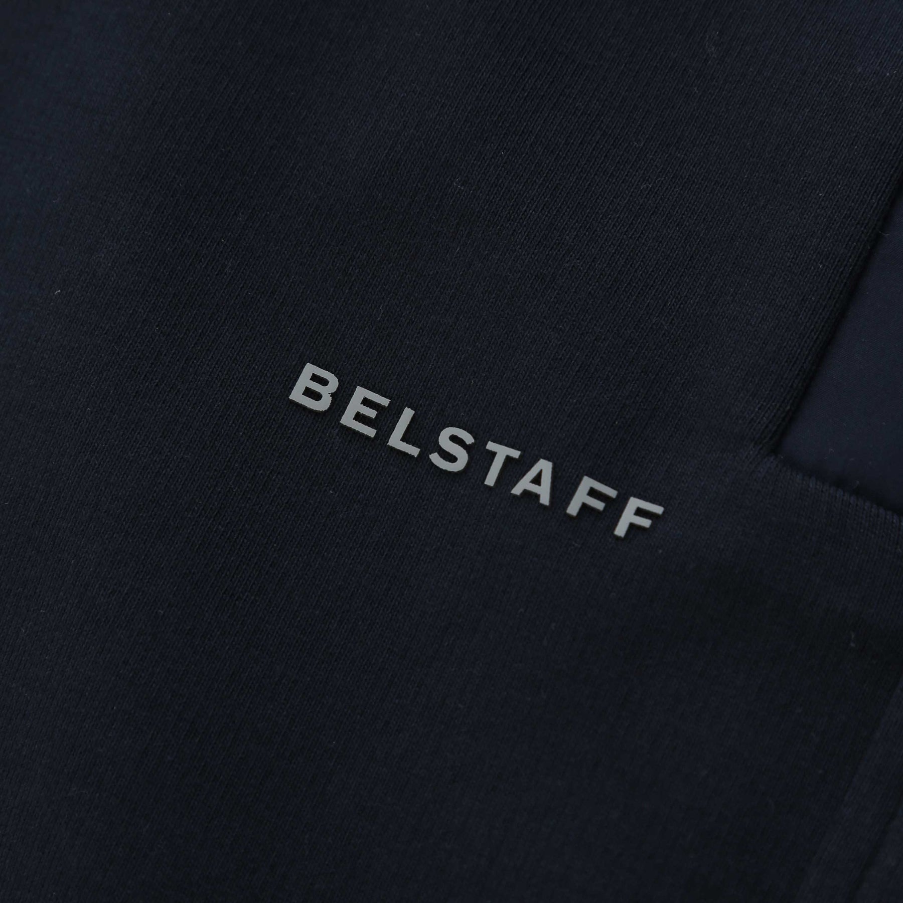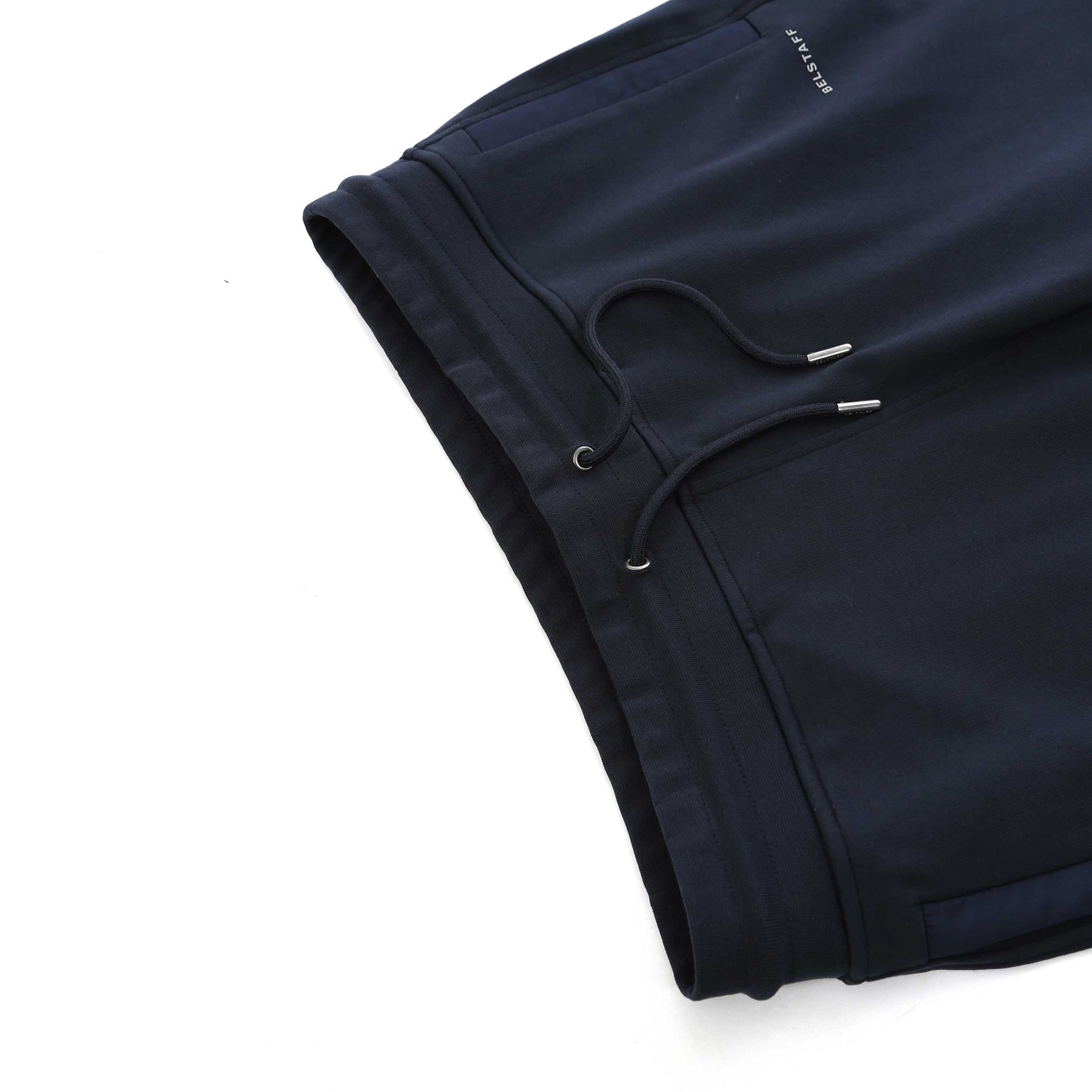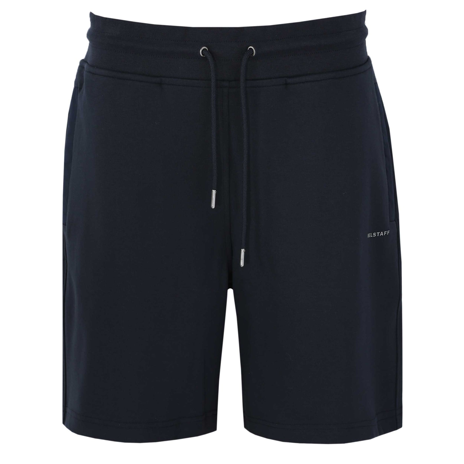 Belstaff Alloy Sweat Short in Dark Ink. This sweat short is constructed with an elasticated drawstring waist. Press stud fastening pockets with a technical shell trim detail. Featuring a rubber Belstaff badge to the left leg. Pair with a Belstaff t-shirt for a casual look.