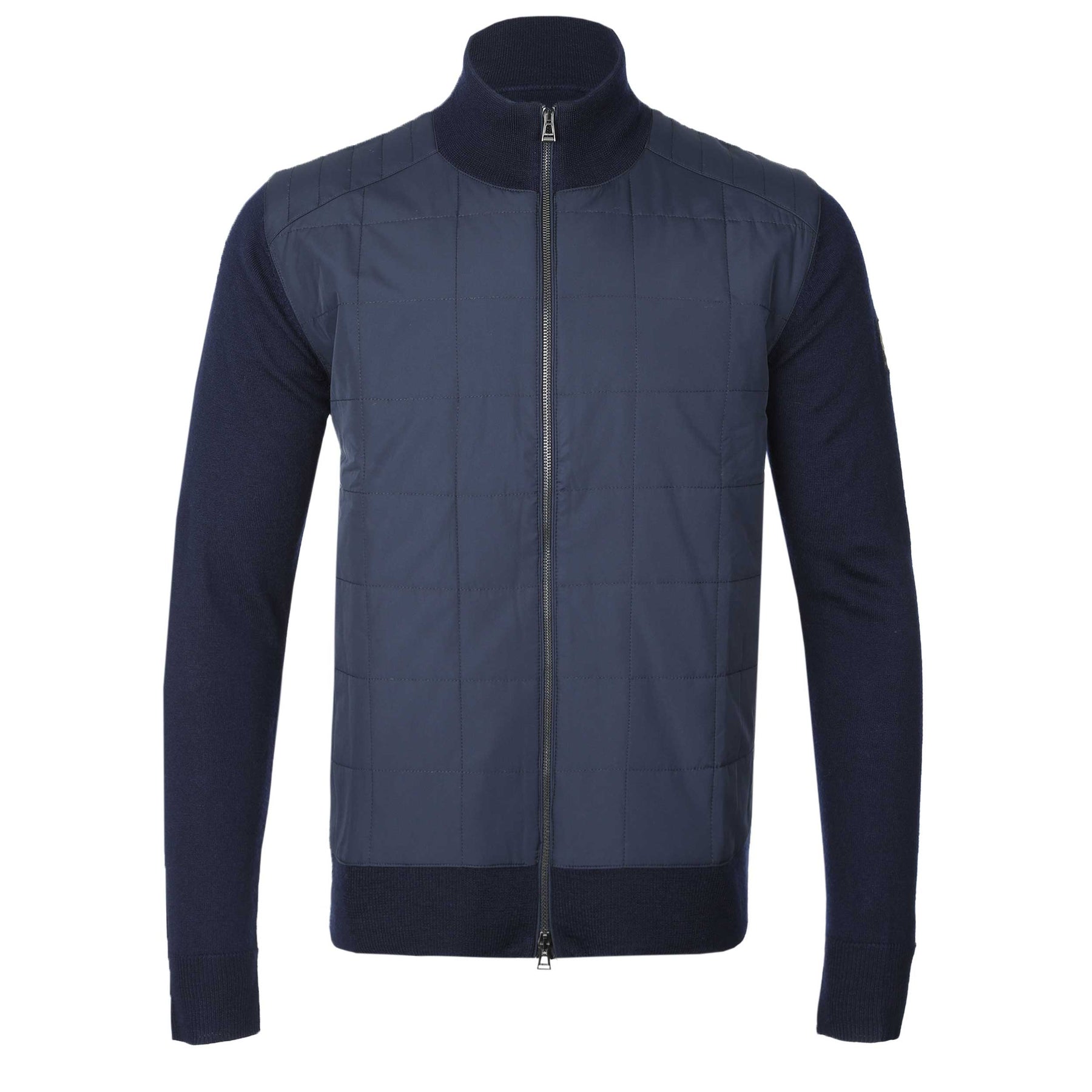 Belstaff Kelbrook Zip Cardigan Knitwear in Dark Ink. A zip up cardigan by Belstaff. A versatile piece featuring cardigan style sleeves with a quilted panel design to the front. Featuring a full zip fastening and the Belstaff logo on the left sleeve. Crafted from 100% Wool.