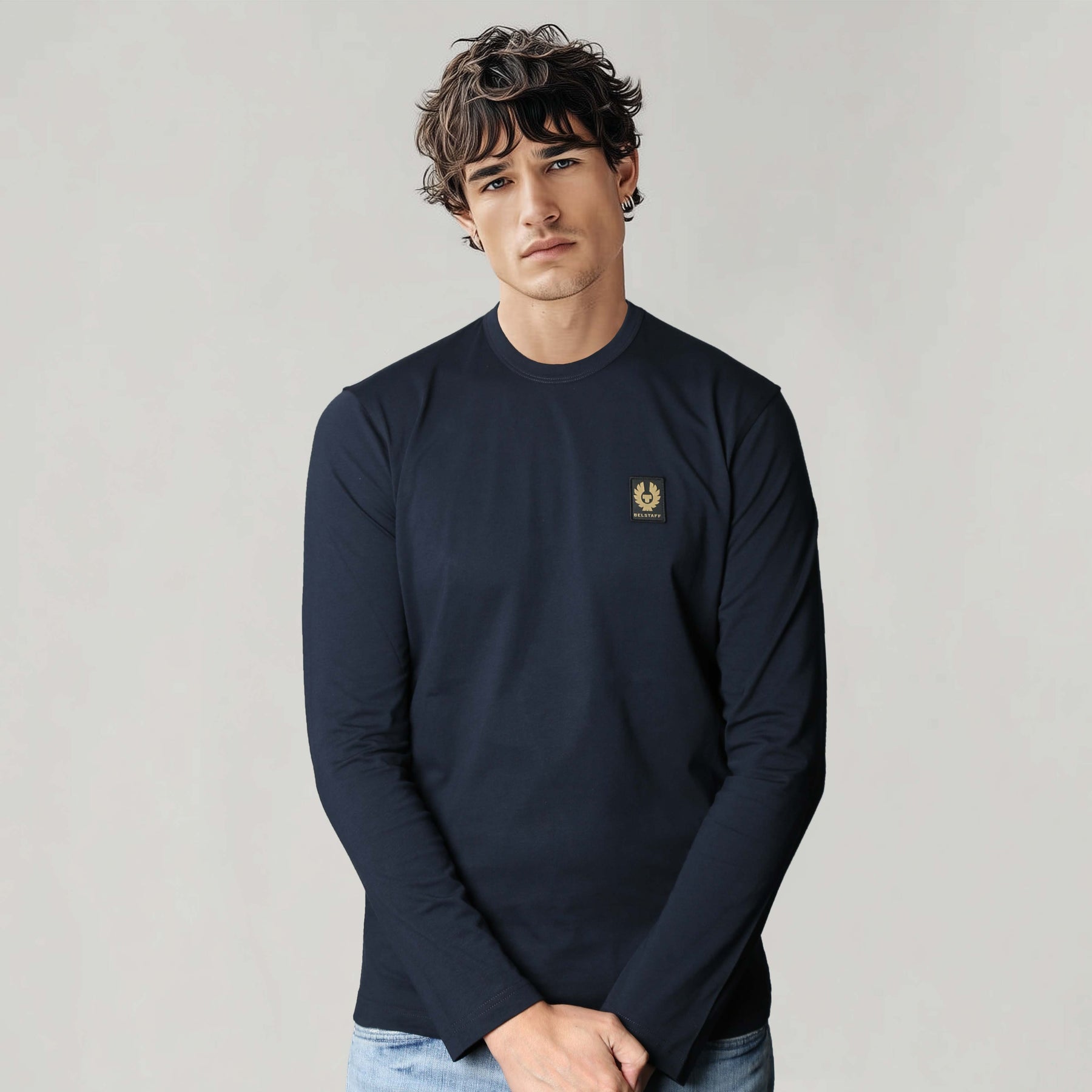Introducing the Belstaff Long Sleeve T Shirt in Navy, a quintessential piece for any modern wardrobe. This classic crew neck t-shirt embodies simplicity and style, making it an essential item for your everyday attire. Designed by the renowned brand Belstaff, this long sleeve t-shirt showcases a commitment to quality and craftsmanship.