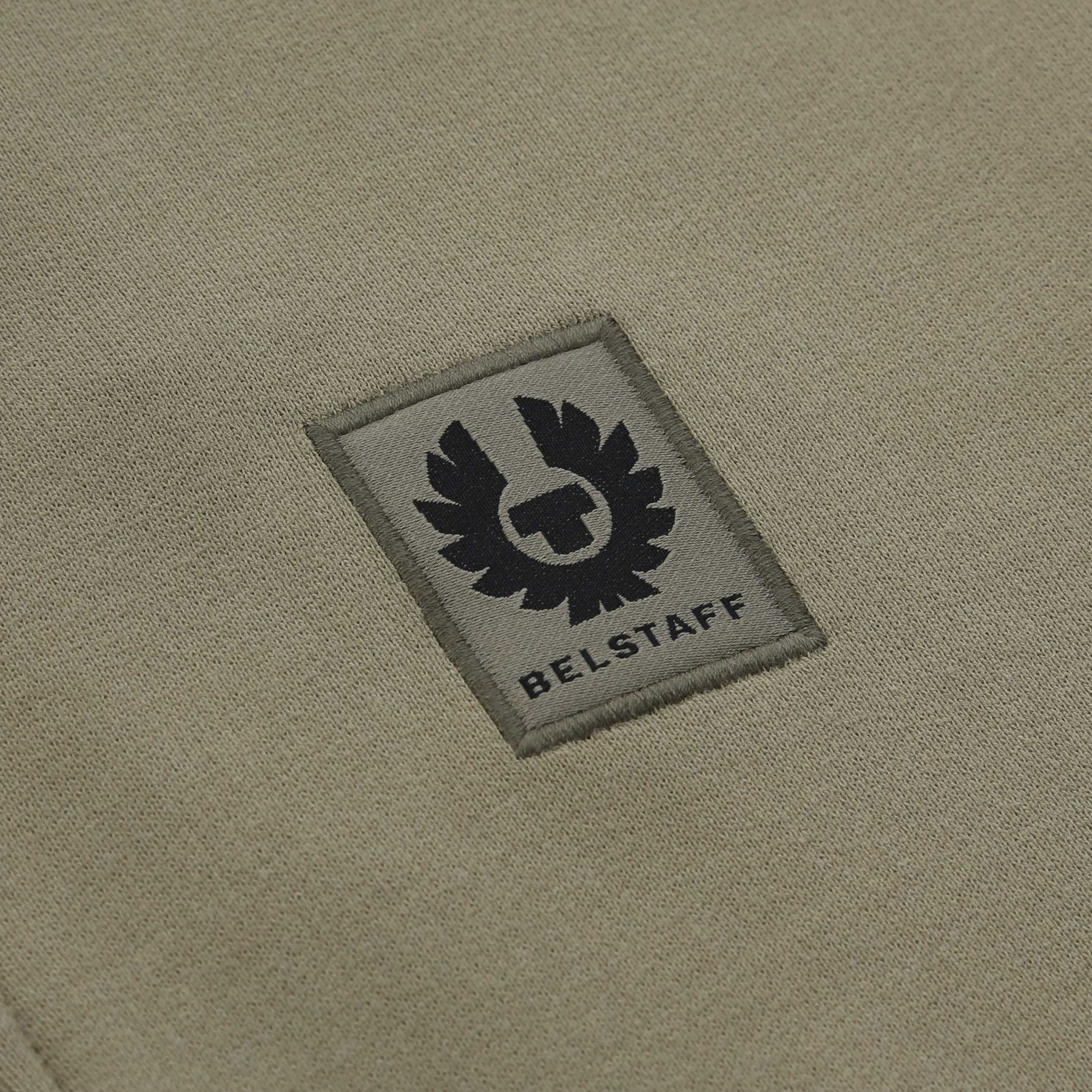 Belstaff Quarter Zip Sweat Top in Fatigue Green. A quarter zip sweat top featuring a funnel neck collar which can be worn flat or zipped up. Ribbed cuffs and waistband. Finished with the signature Belstaff logo badge on the chest. Team up with sweat pants or jeans.