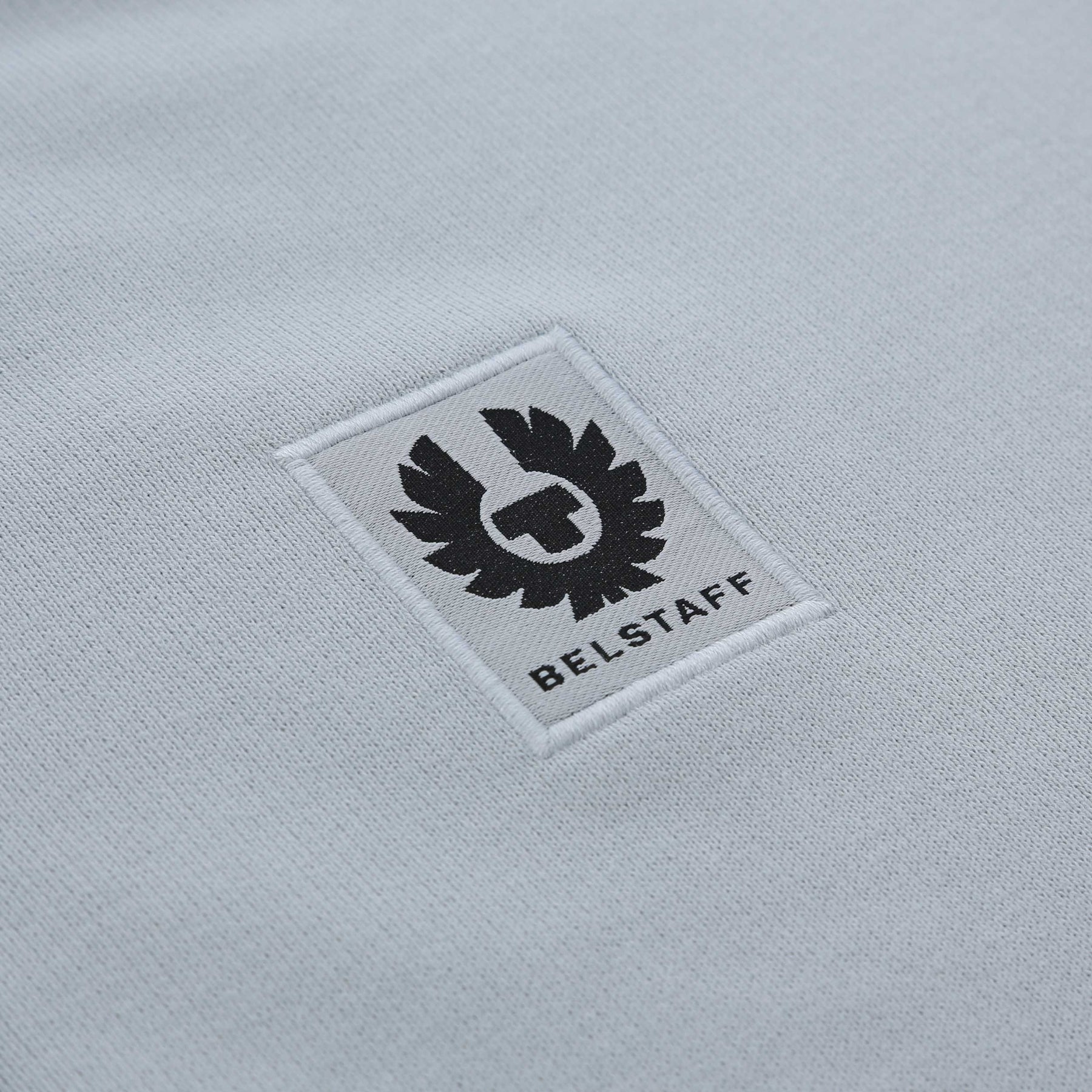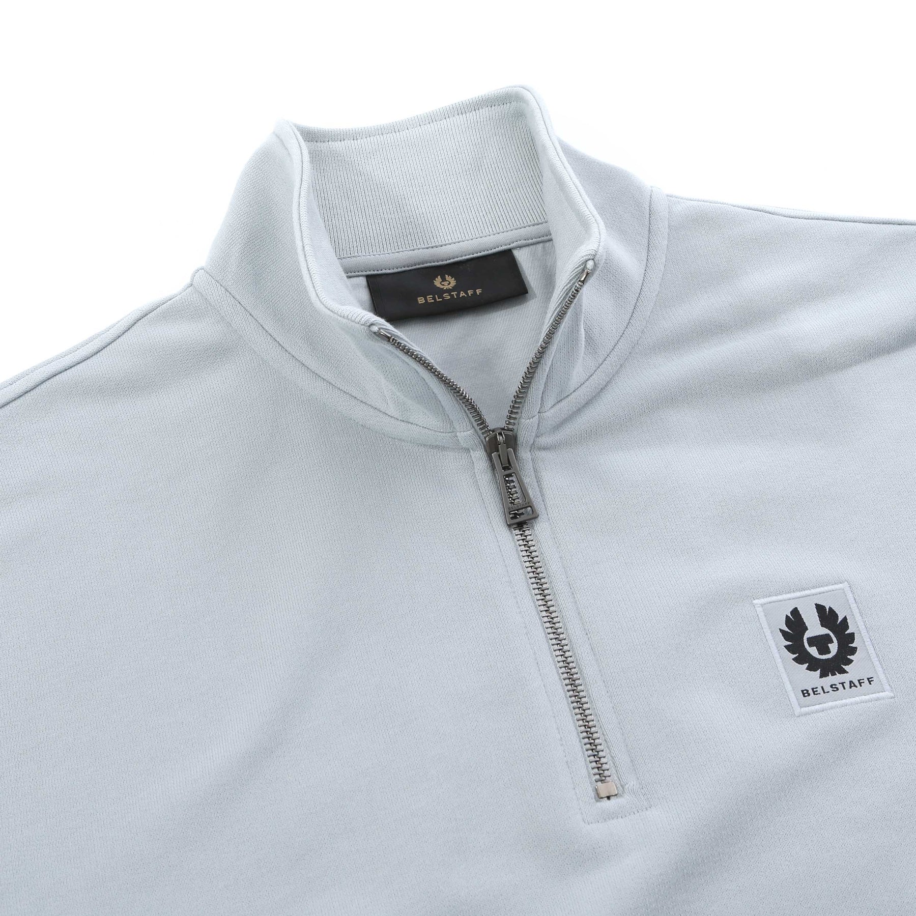 Belstaff Quarter Zip Sweat Top in Quarry Blue. A quarter zip sweat top featuring a funnel neck collar which can be worn flat or zipped up. Ribbed cuffs and waistband. Finished with the signature Belstaff logo badge on the chest. Team up with sweat pants or jeans.