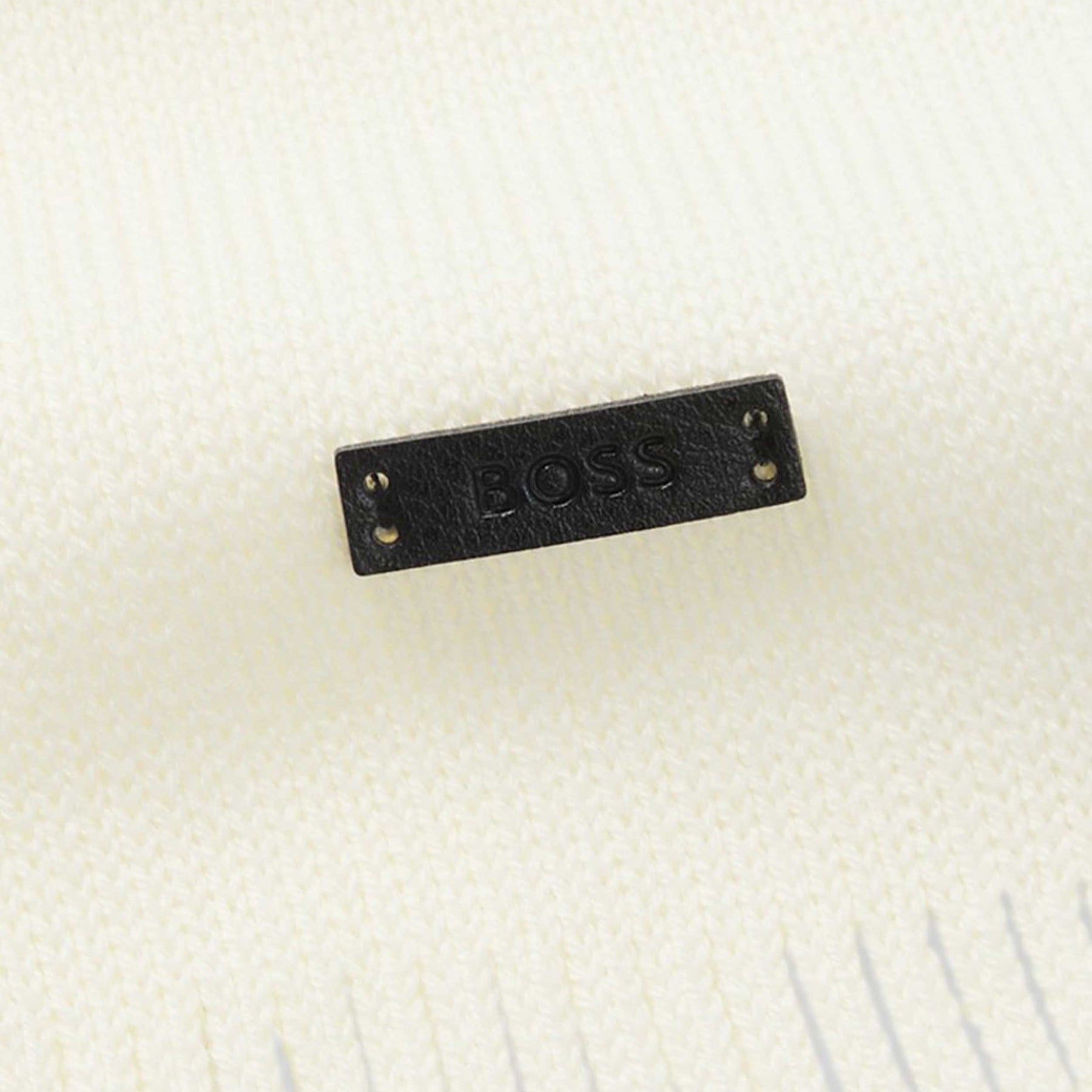 BOSS Albas Scarf in Open White. Scarf by BOSS. Solid colour scarf with a small BOOS leather logo badge. Fine Knit with short fringes. Perfect scarf for those winter walks. Dimensions: approx. 32 x 166 cm.