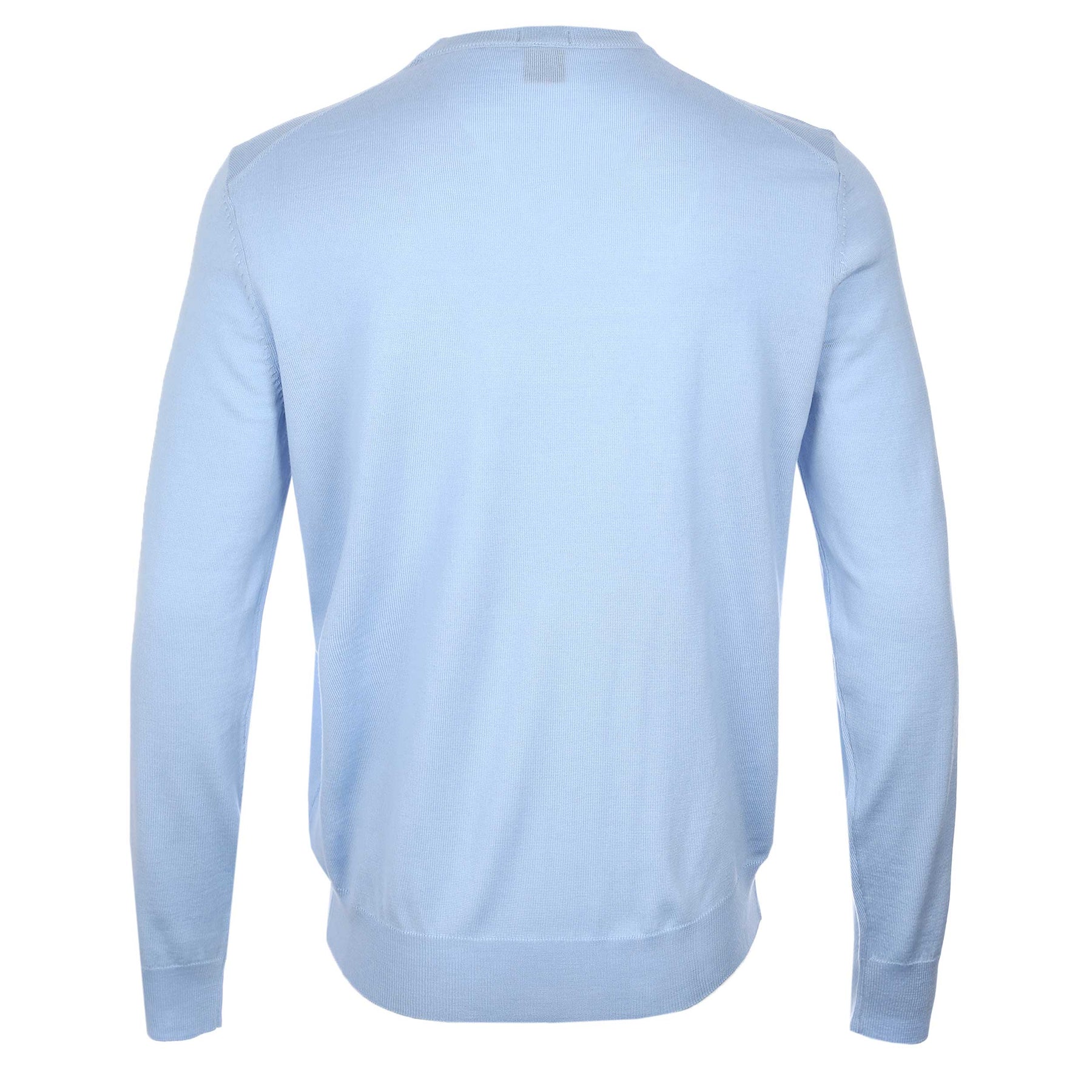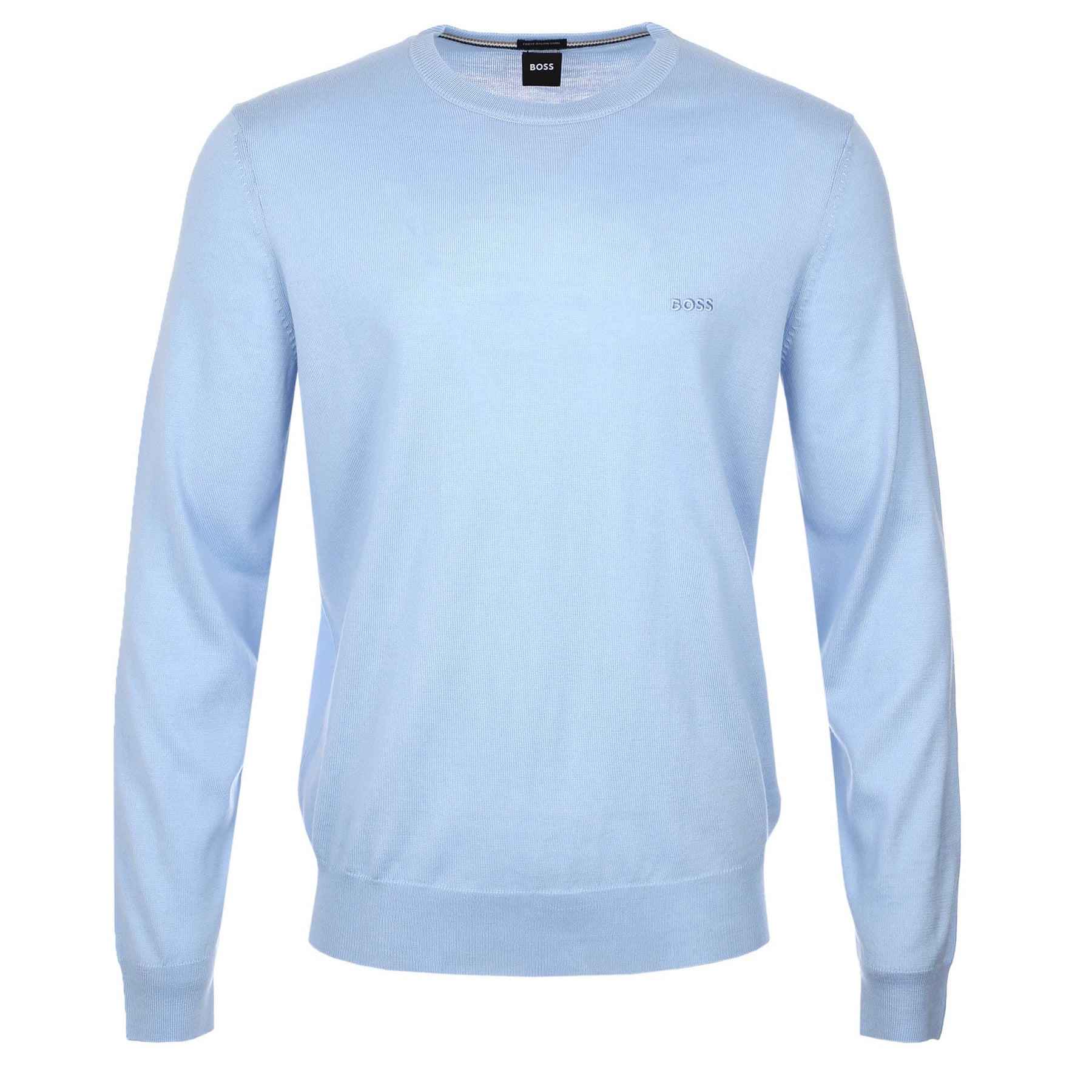 BOSS Botto L Knitwear in Sky Blue. A regular fit, crew neck knitwear by BOSS. It features long sleeves, ribbed neck, cuffs and waistband. Tonal embroidered logo to the chest. An adaptive knitwear for smart or casual.