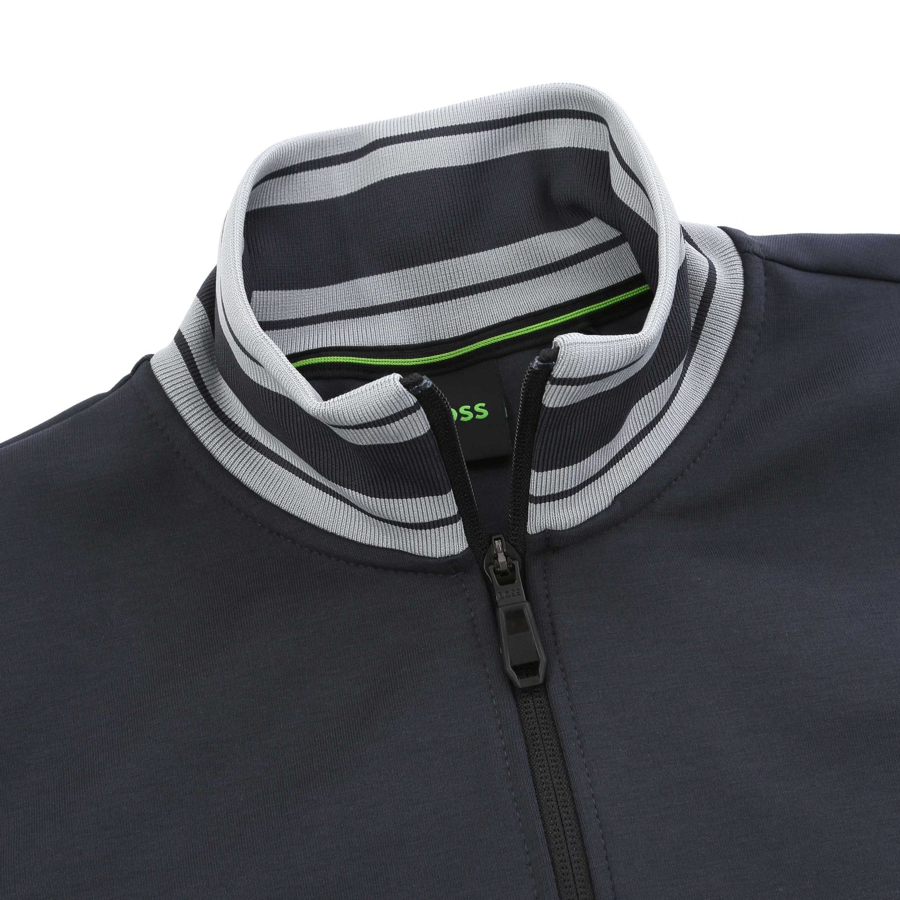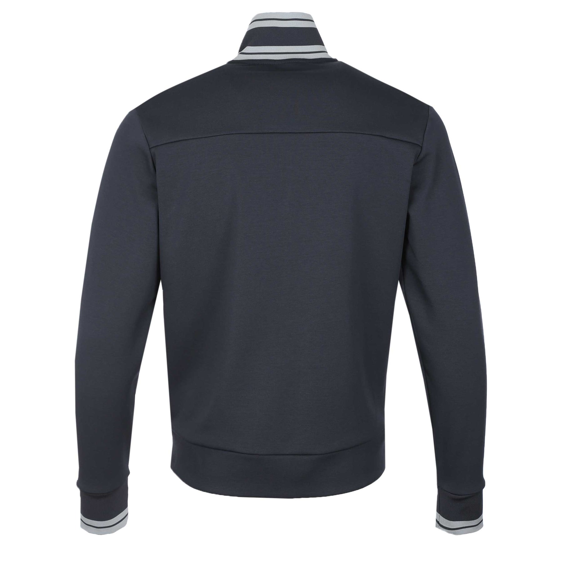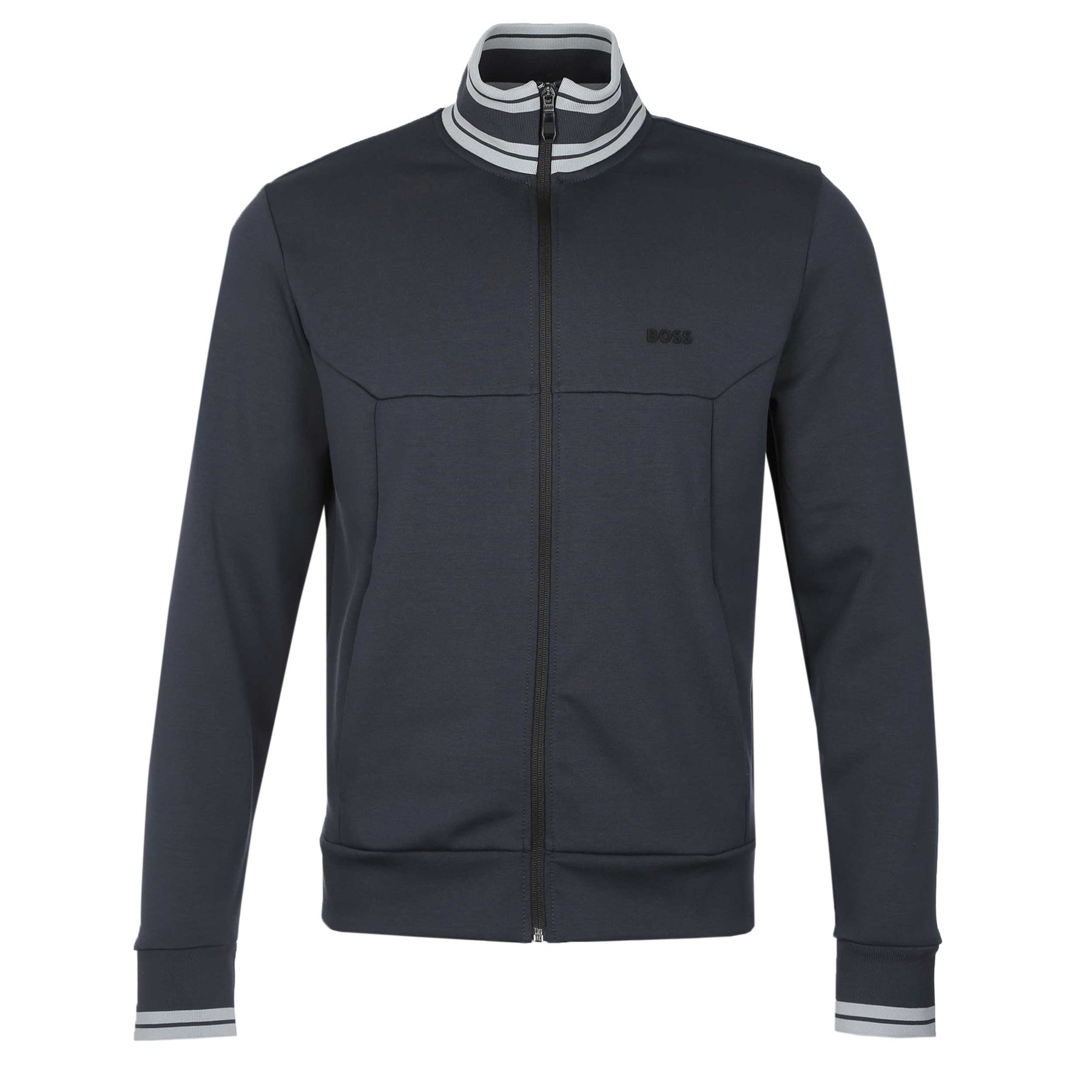 BOSS FZ Zone Sweatshirt in Dark Blue. A regular fit sweat top by BOSS, built for comfort. This Boss sweat top features a full length zip fastening and two side pockets. Contrasting colour trim detailing to the collar and cuffs. Tonal rubber BOSS branding to the chest.
