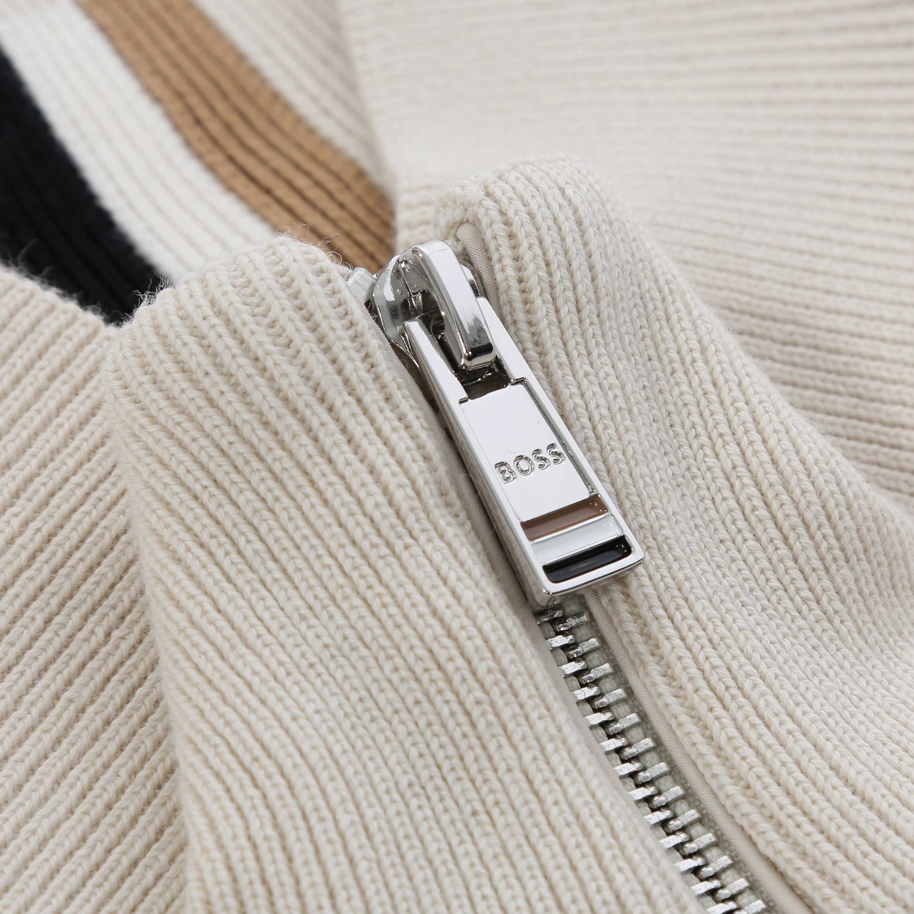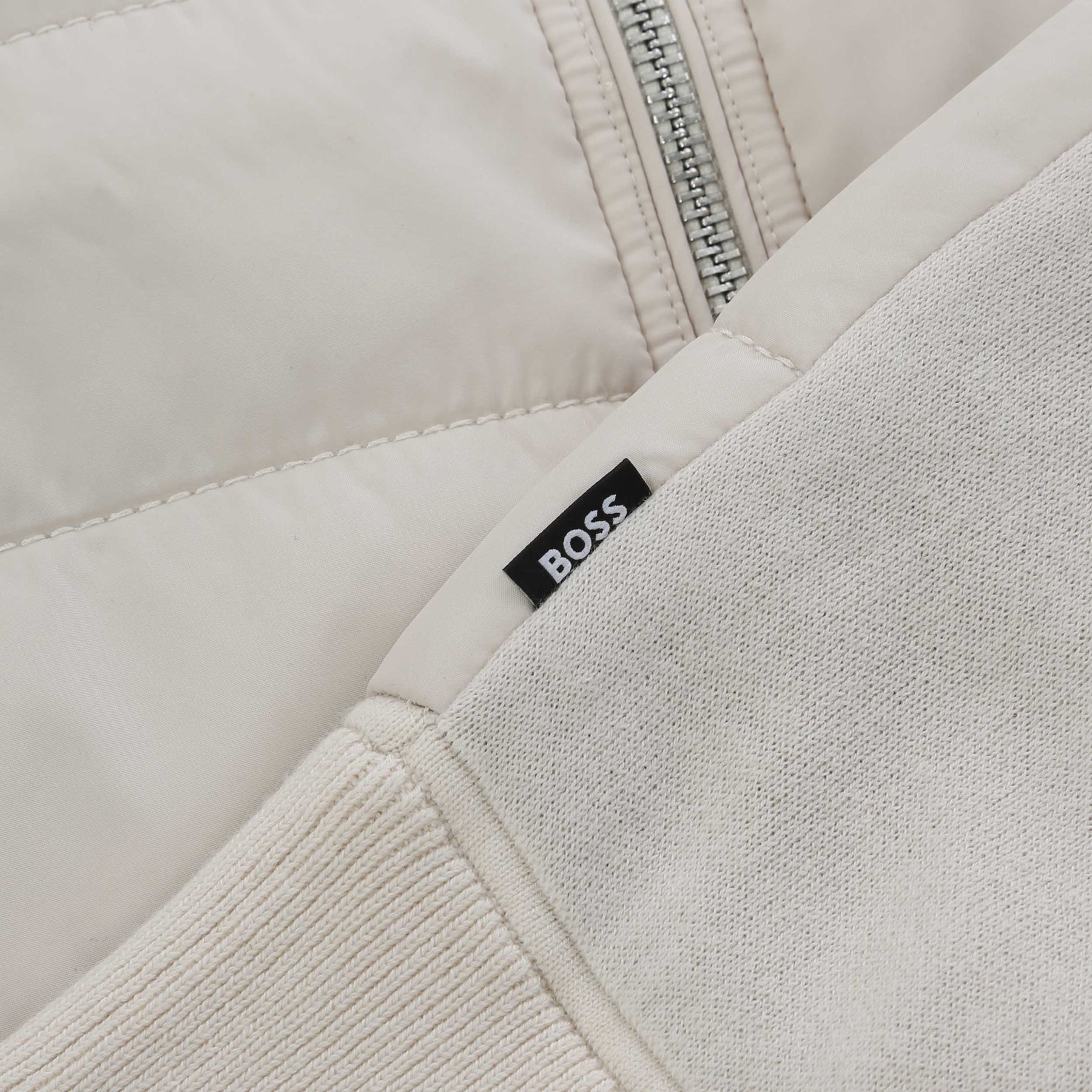 BOSS H Hernesto Knitwear in Cream. This mixed-media jacket combines a lightly padded front with knitted sleeves and reverse for a sharp, modern contrast. Designed with a ribbed stand collar, ribbed cuffs and a structured waistband, it delivers a clean, athletic silhouette. Two press-stud waist pockets offer easy functionality, while a double monogram logo on the upper left sleeve adds a subtle premium finish. A versatile layering piece that bridges smart and casual with zero effort.