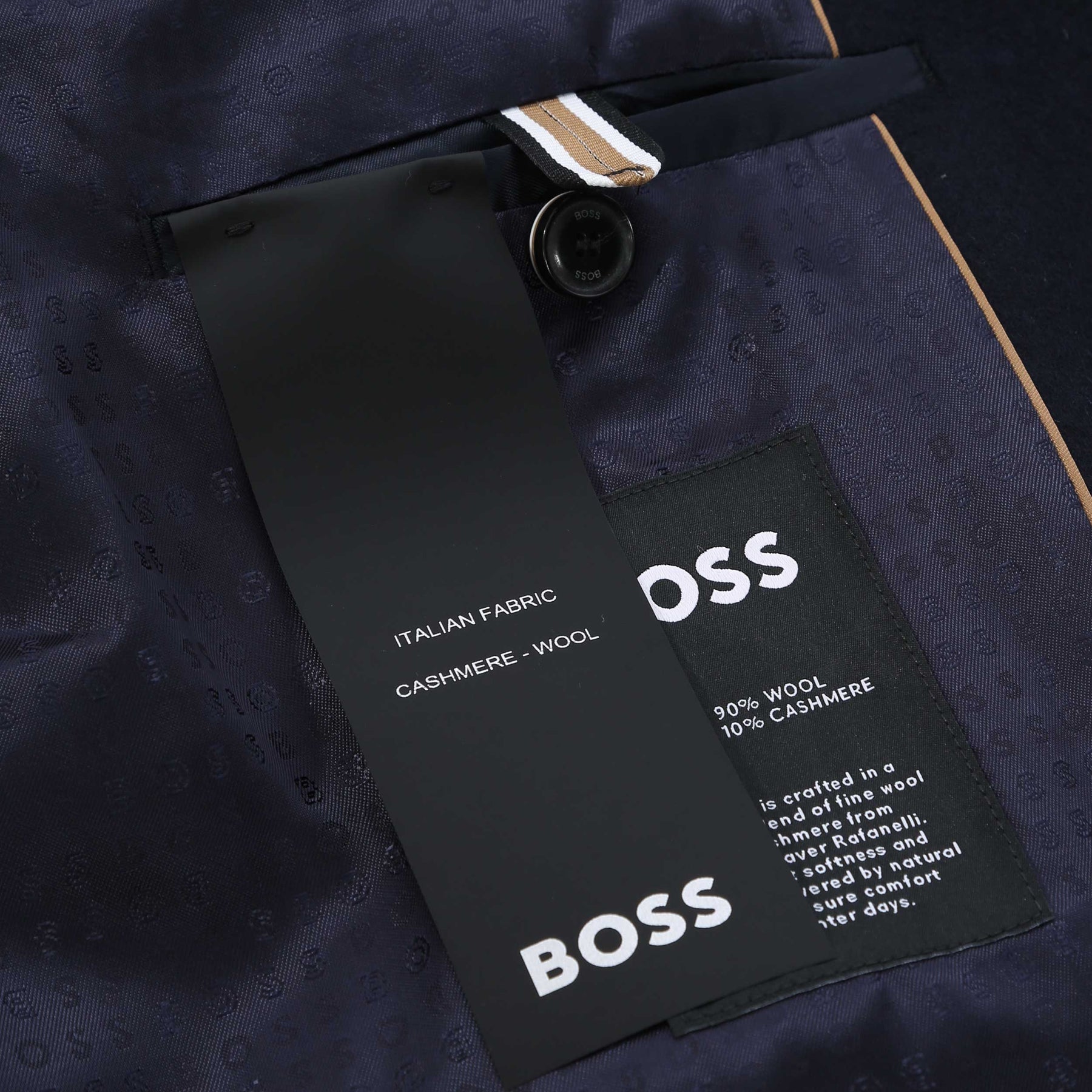 BOSS H Hyde SU 254 Overcoat in Dark Blue. A classic BOSS overcoat in slim fit, made from a mix of virgin wool and cashmere. This hugo boss overcoat features notch lapels and is fully lined. It has a 3 button fastening to the front and to the cuff. 1 vent to the rear of the overcoat. 2 slash pockets.