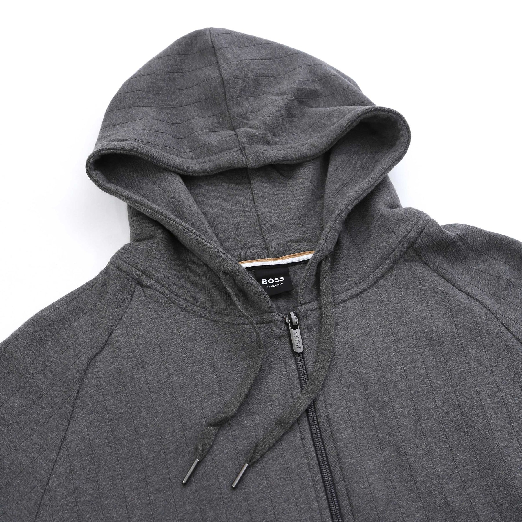 BOSS Heritage Jacket H Sweatshirt in Medium Grey. A heritage-inspired hoodie by BOSS. This zip-up style jacket has a drawstring hood with branded metal toggles. Full zip fastening front. Subtle pinstripe design throughout the sweatshirt. Metal Boss logo tab to the front. Finished with slip pockets.