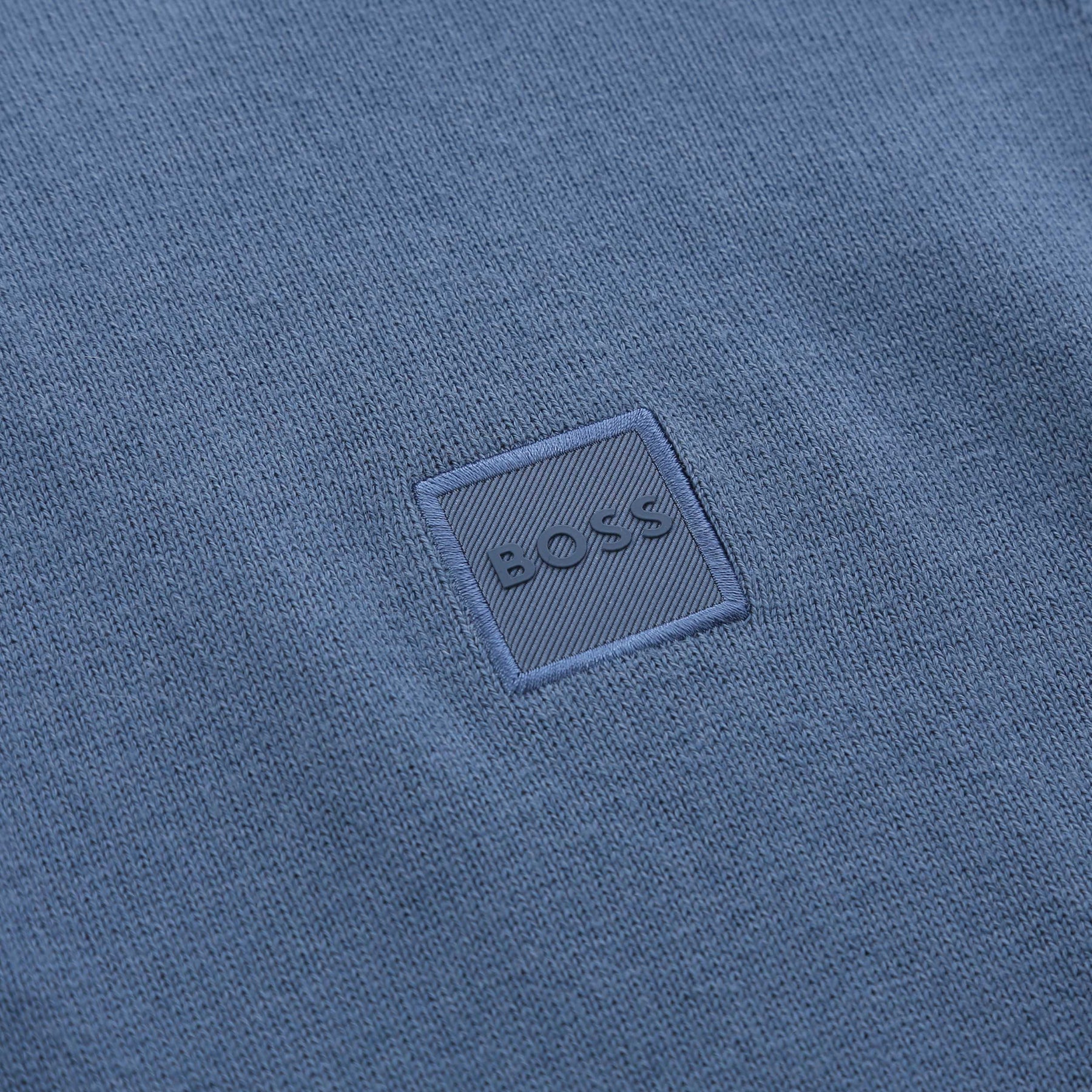 BOSS Kanobix S Knitwear in Open Blue. A classic piece of knitwear by BOSS. This jumper is a regular fit with a stand collar and quarter zip fastening placket. It has ribbed cuffs, cuts to a regular length and is detailed with a tonal BOSS square logo on the chest. Constructed from a cotton cashmere mix.