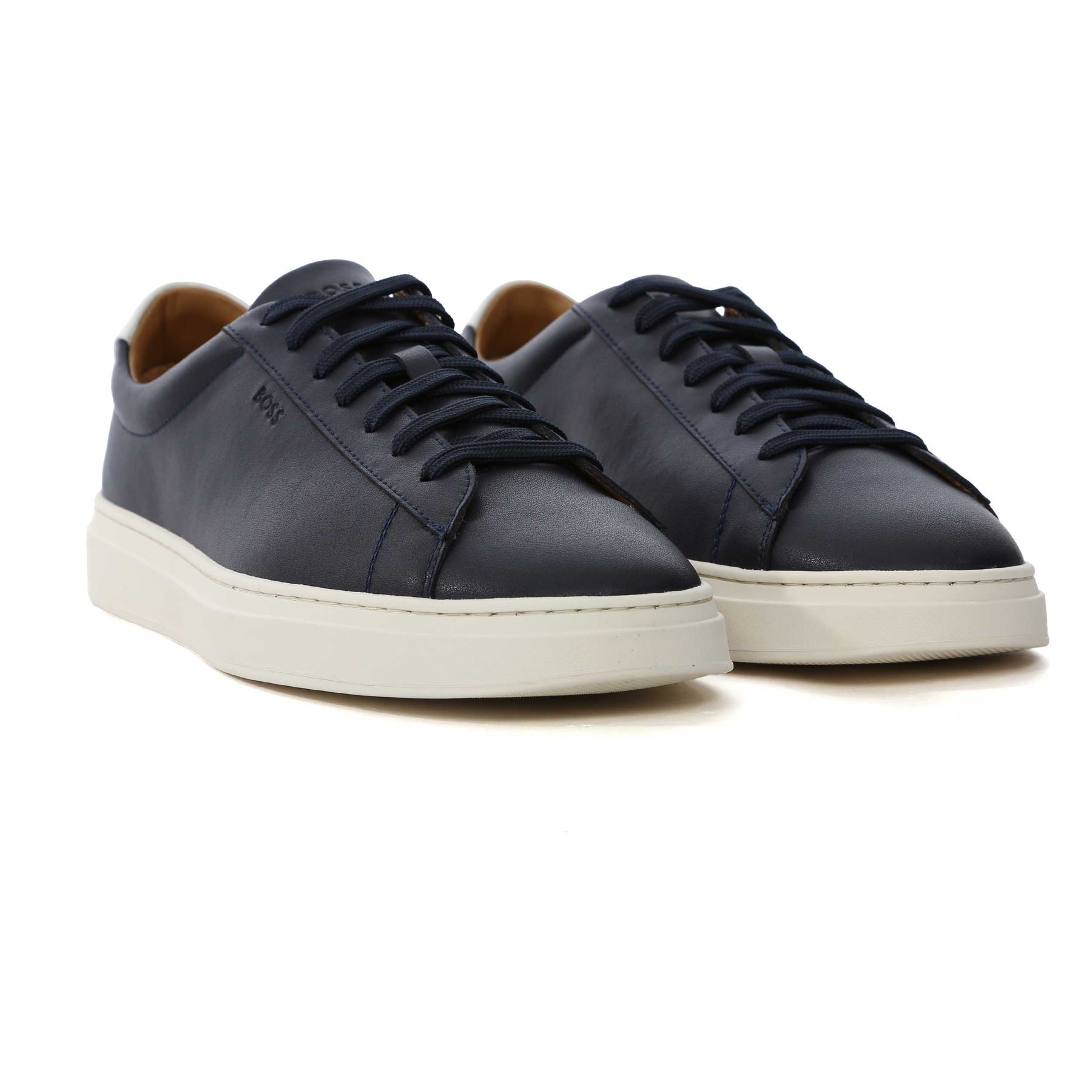 BOSS Kieran Tenn allt Trainer in Dark Blue. These low top BOSS trainers arrive with a 7 hole lace up and a tonal colour sole unit. Textured leather trainer featuring subtle BOSS logo. Contrasting heel tab. A perfect blend of luxury and everyday comfort.