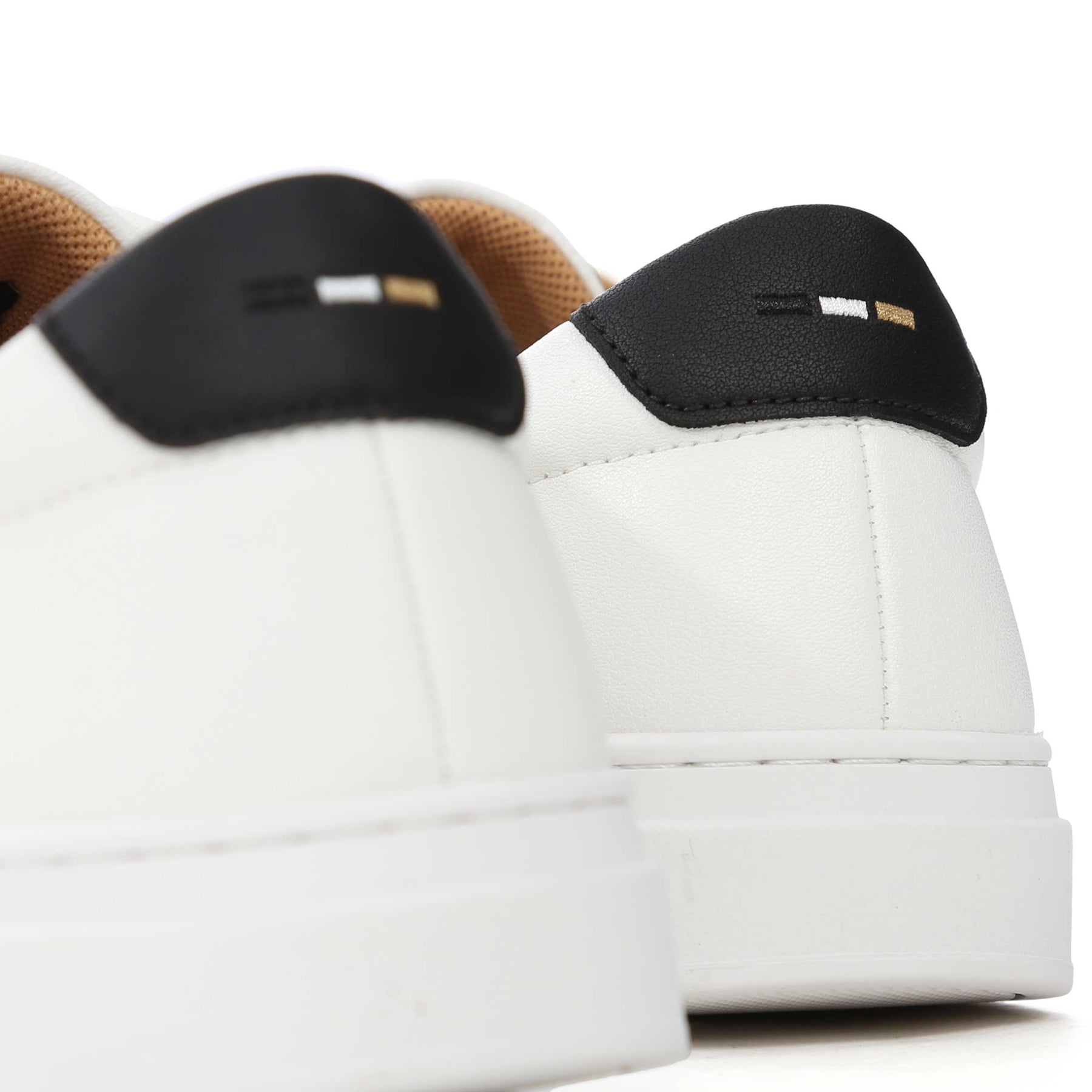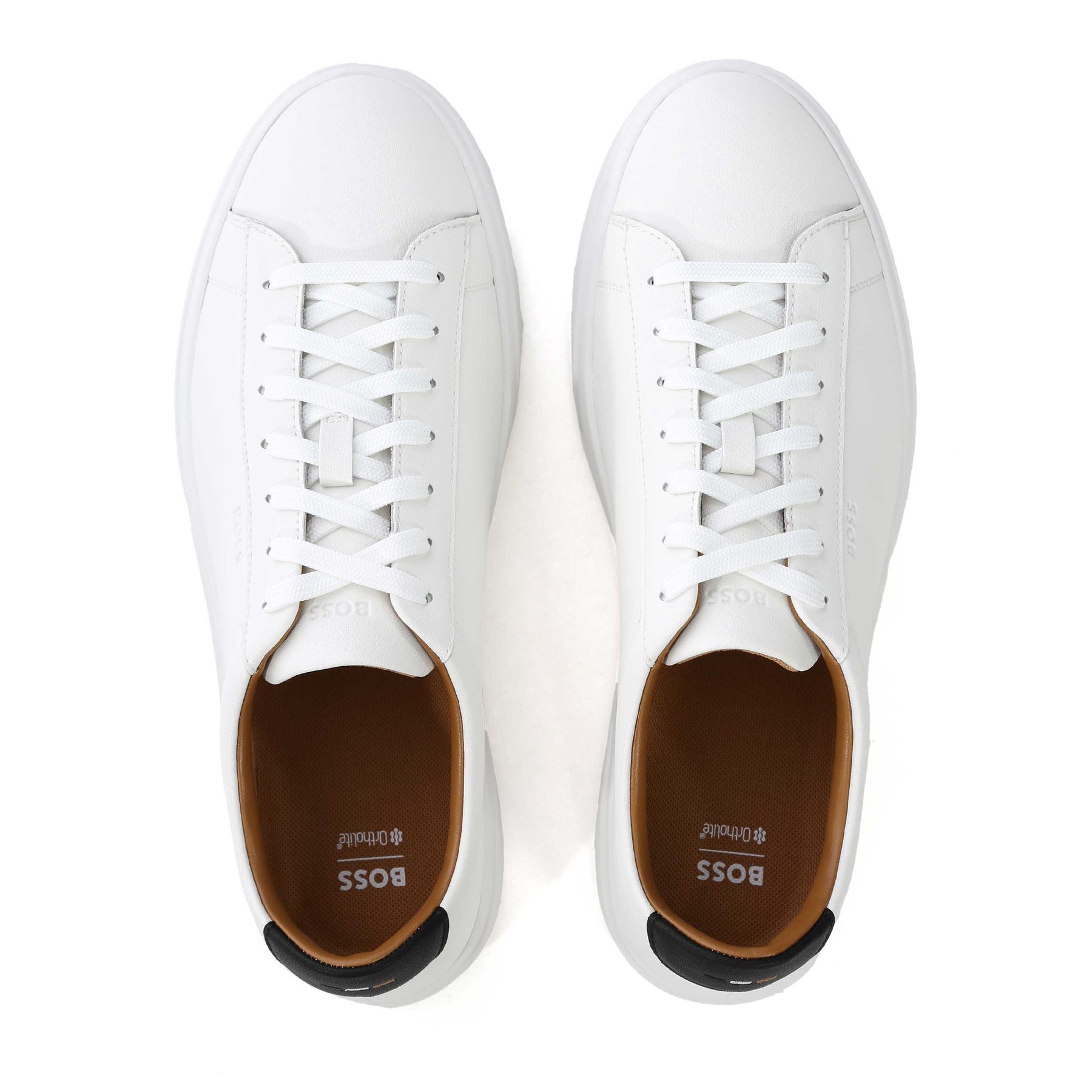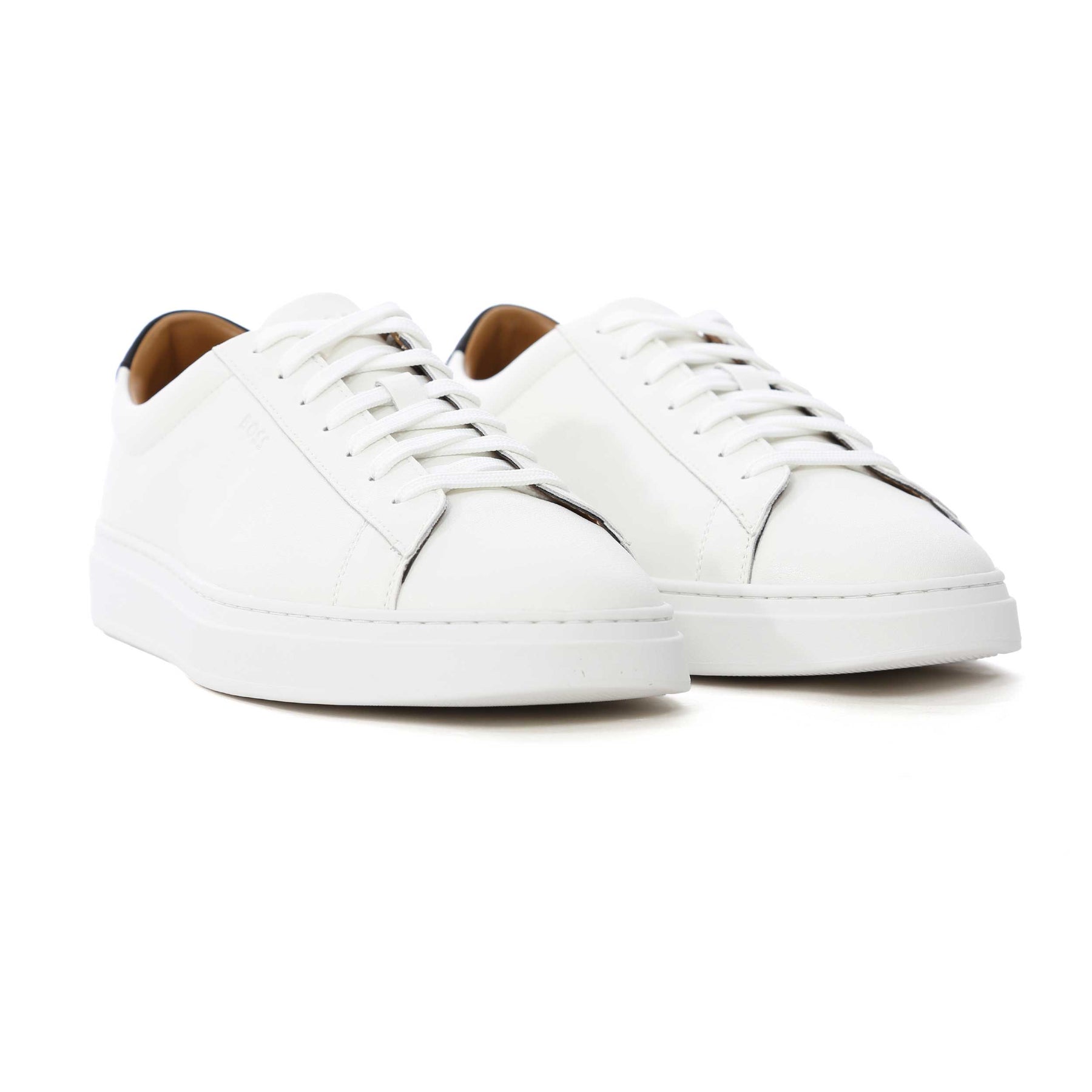 BOSS Kieran Tenn allt Trainer in Natural. These low top BOSS trainers arrive with a 7 hole lace up and a tonal colour sole unit. Textured leather trainer featuring subtle BOSS logo. Contrasting heel tab. A perfect blend of luxury and everyday comfort.