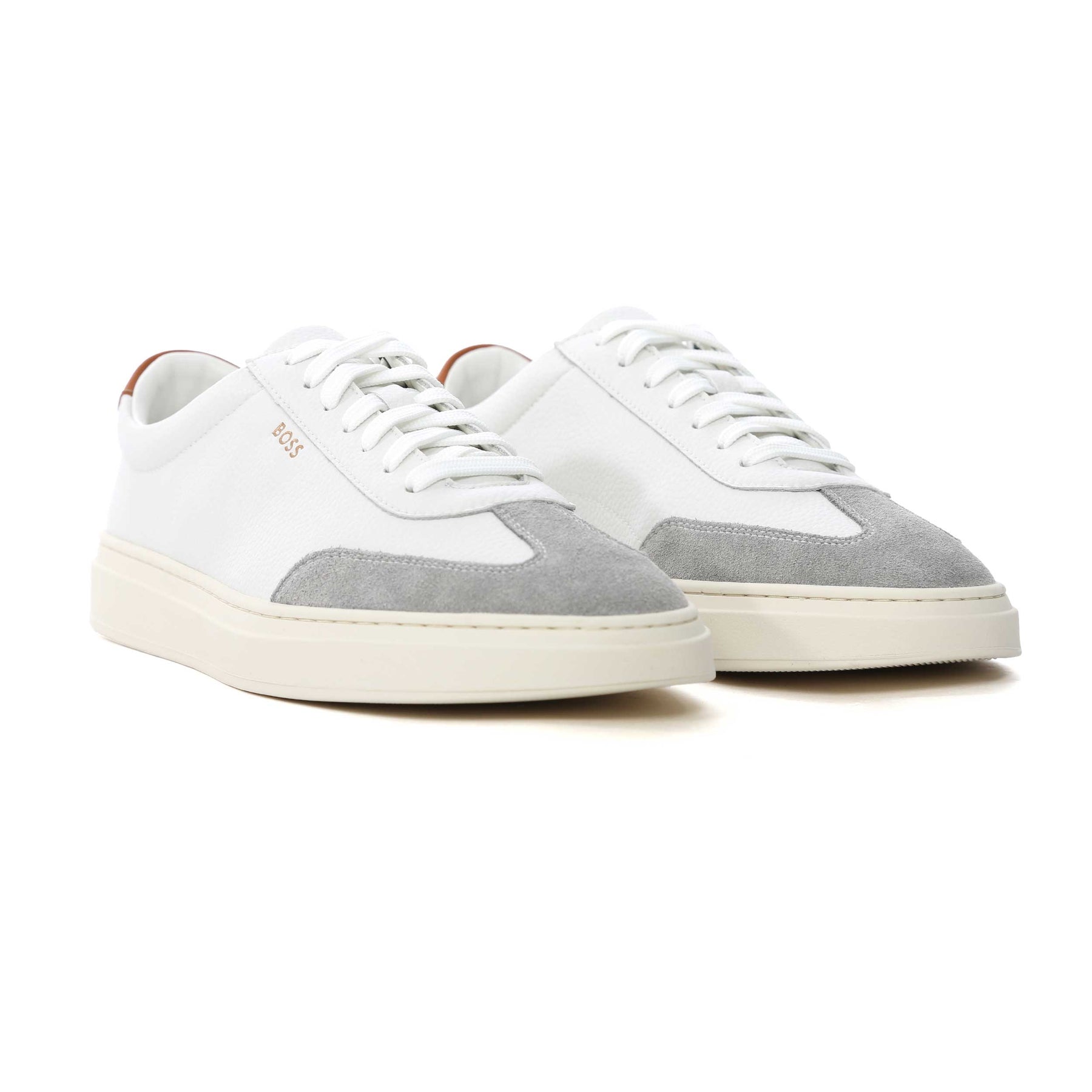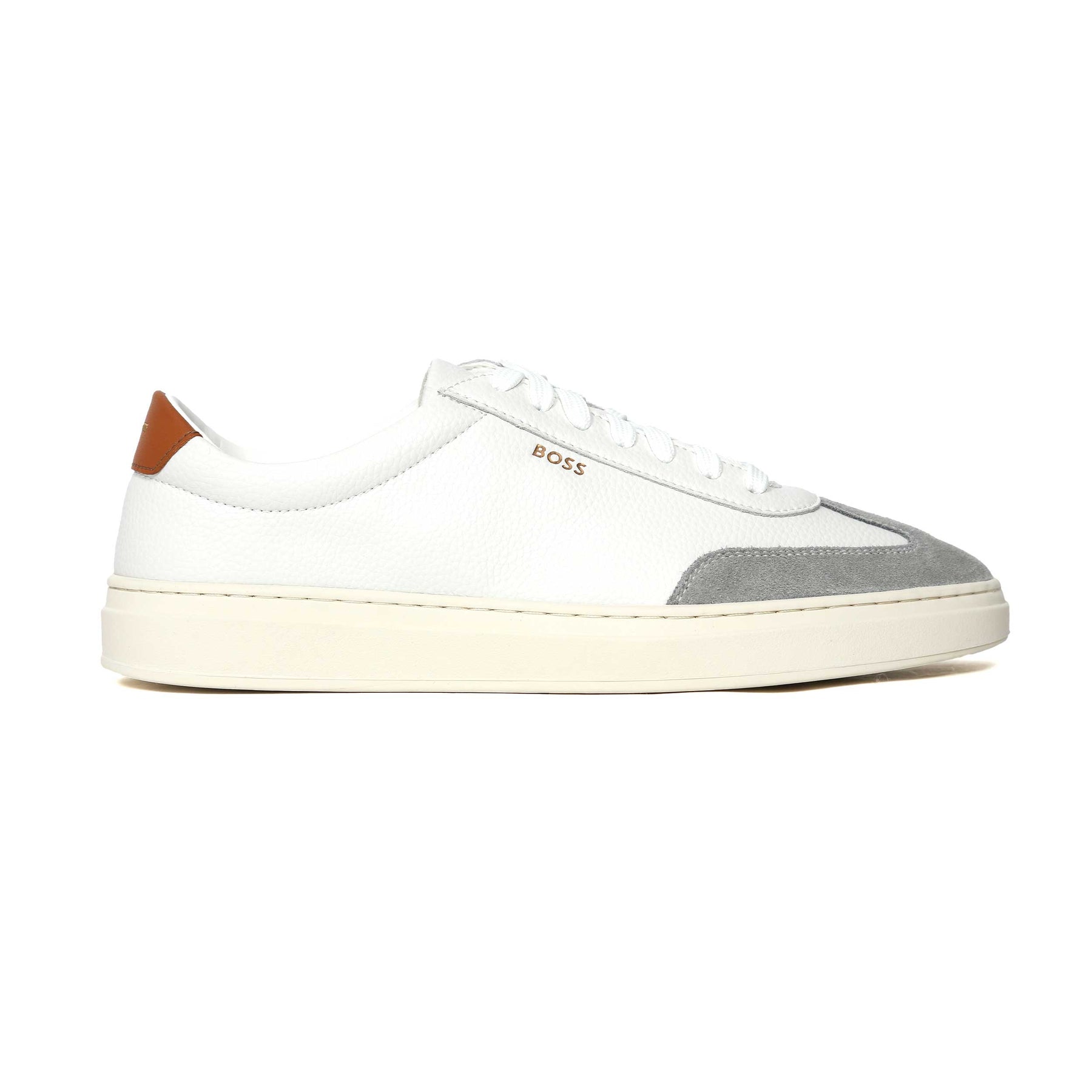 BOSS Kieran Tenn sdgral Trainer in Natural. These low top BOSS trainers arrive with a 7 hole lace up and a tonal colour sole unit. Textured leather trainer featuring subtle BOSS logo. Contrasting heel tab. A perfect blend of luxury and everyday comfort.