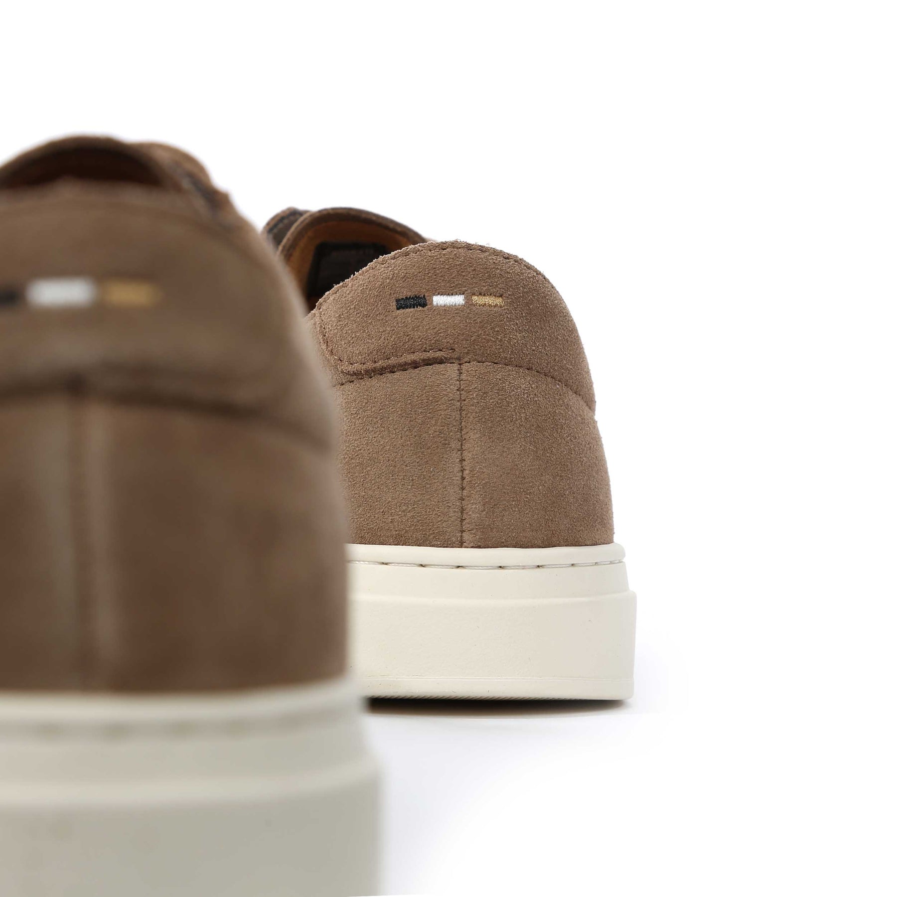 BOSS Kieran Tenn wcsd Trainer in Medium Beige. These low-top BOSS trainers feature a clean 7-eyelet lace-up and a contrasting sole for a modern, understated look. Crafted from a rich suede leather with subtle BOSS branding on the side, they’re finished with a tri-colour embroidered heel tab for a signature touch. A refined mix of luxury detailing and everyday comfort.