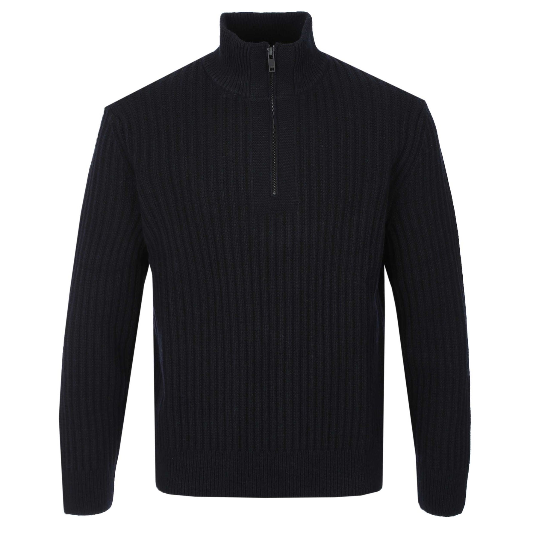 BOSS Kwinter Knitwear in Dark Blue. A classic piece of knitwear by BOSS. A knitted quarter-zip with a structured ribbed stand collar, ribbed cuffs, and a stretch ribbed hem for a secure, comfortable fit. Finished with a subtle Boss branded pinch tag at the lower side seam, it’s a modern everyday layer with just enough edge.