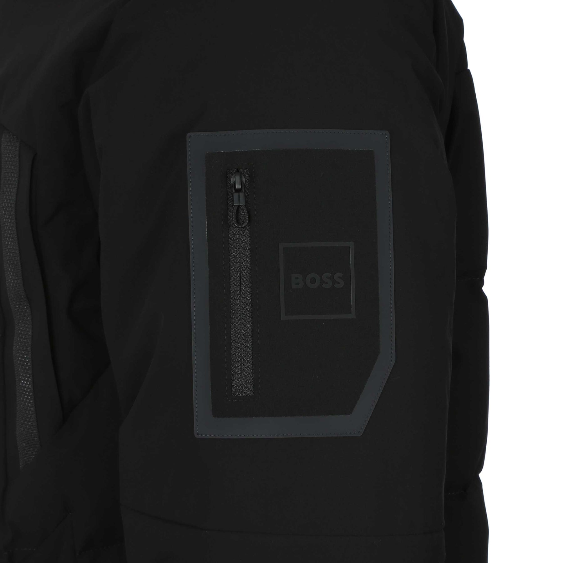 BOSS OW Block X Parka Jacket in Black. Introducing the BOSS Men's Water-Repellent Parka Jacket—a stylish and functional outerwear piece designed for everyday wear. This BOSS quilted parka delivers serious cold-weather protection with a clean, modern look. Designed in a regular fit, it features a detachable hood and a full zip closure with additional button fastening for extra coverage. The water-repellent outer fabric and specialised insulation offer reliable warmth, while zipped exterior pockets keep essentials secure. A signature BOSS logo patch on the sleeve completes the piece with a refined finishing touch.