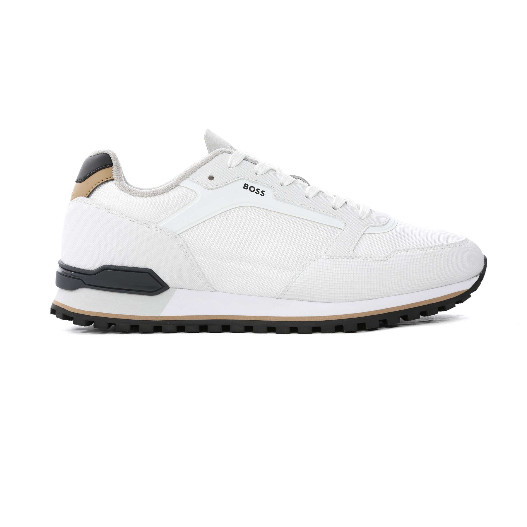 BOSS Parkour L Runn txhf Trainer in White. BOSS trainer constructed in a contemporary running style. Crafted with mesh and suede panels to give the trainer it's sporty look. BOSS logo on the side panel. Finished with a contrasting sole.