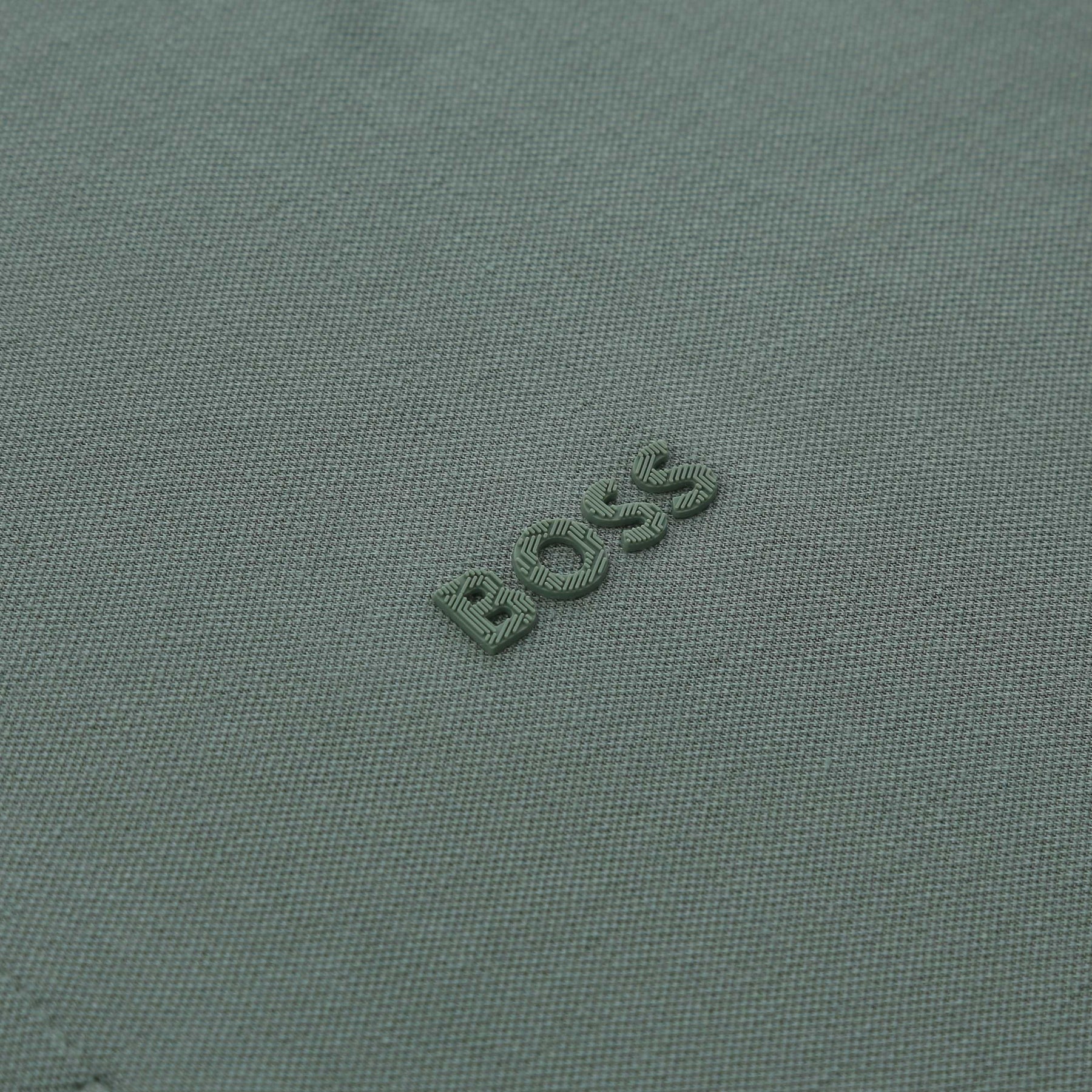 BOSS PL Mirror Paddy Polo Shirt in Open Green. Short sleeve polo shirt by BOSS. Cut to a regular fit with a 3 button fastening placket. Rubberised raised tonal BOSS logo to the chest. Textured detailing to the collar. Ribbed collar and cuffs.