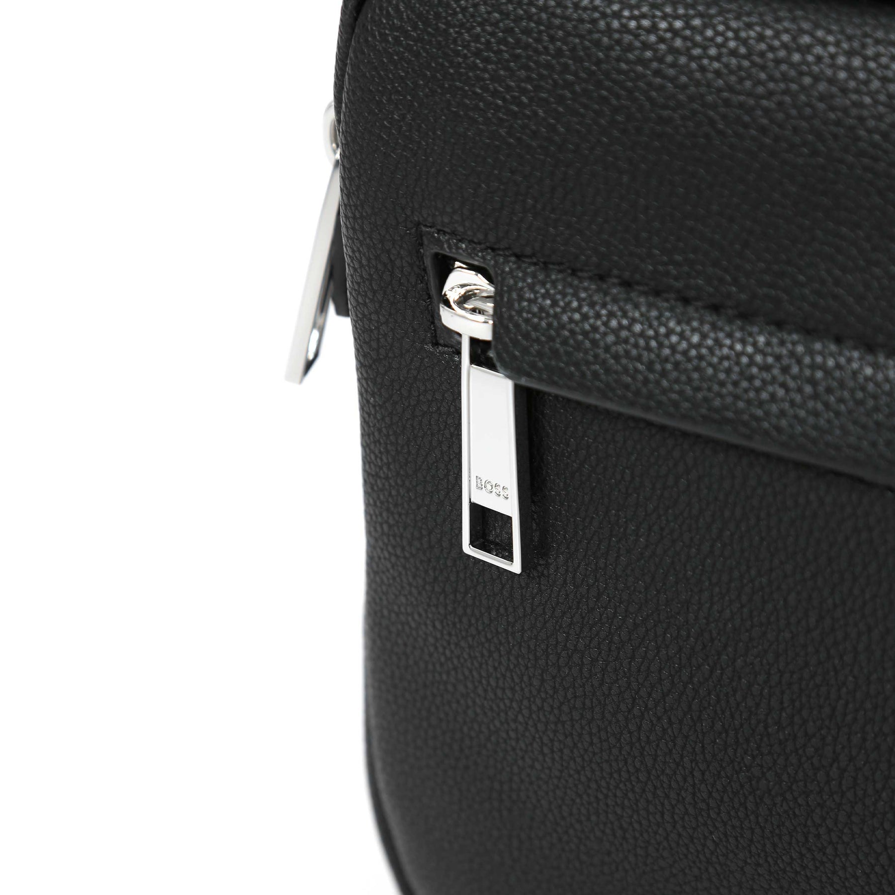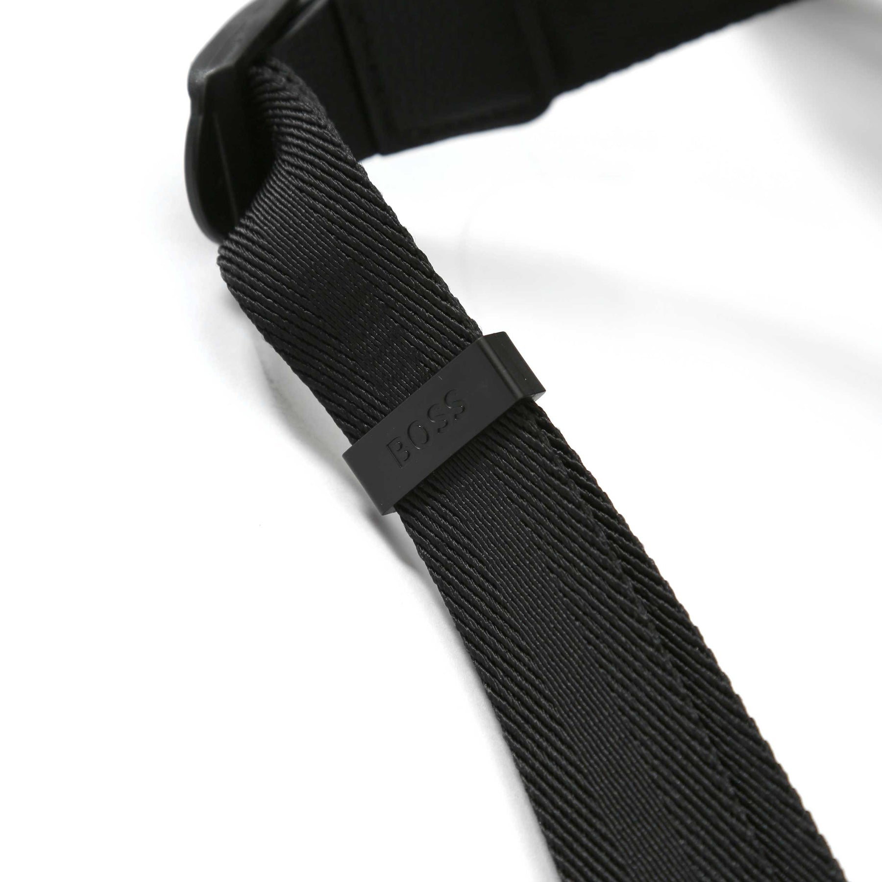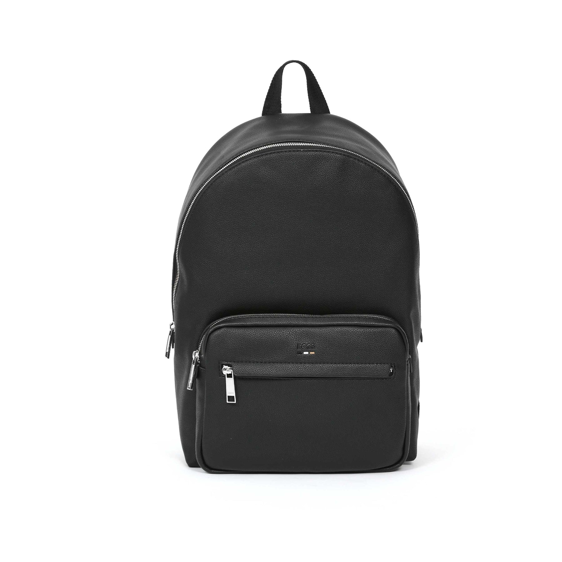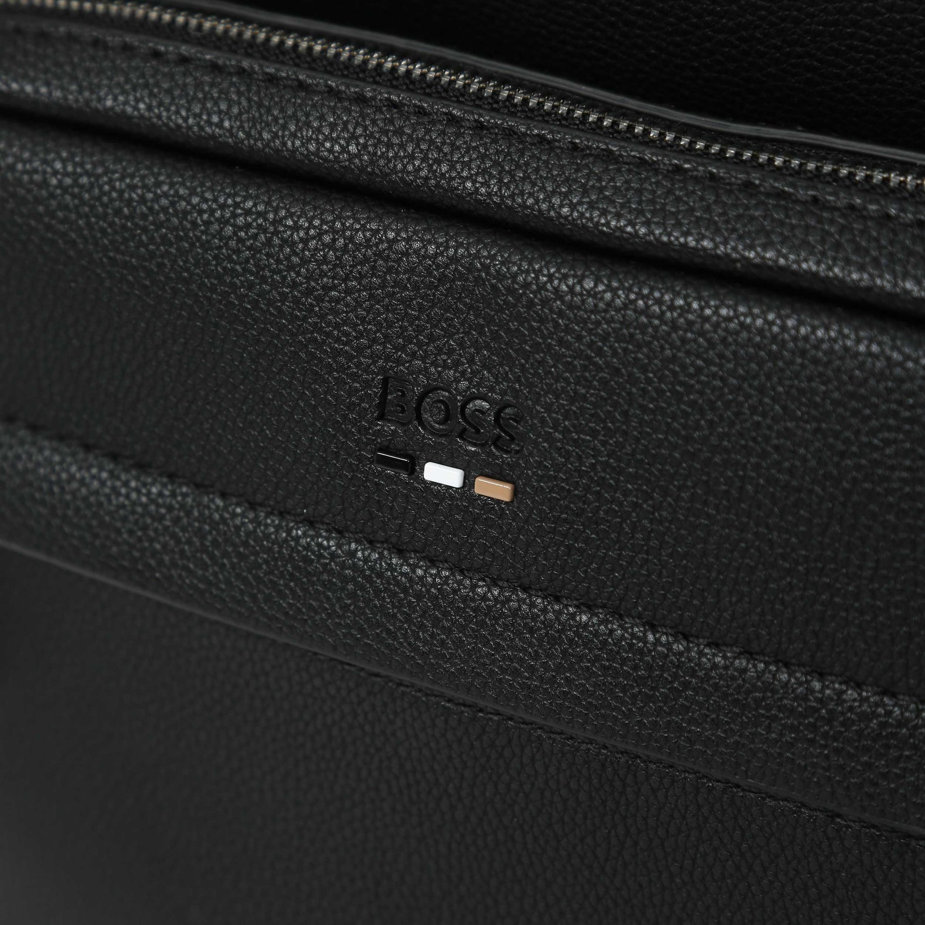 BOSS Ray_Backpack in Black. Man Bag by BOSS. Main compartment with a branded zip fastening. Adjustable shoulder strap. Inside this Hugo Boss bag has 1 slot compartment and 2 zip compartments. BOSS logo and tri-colour design to the front. Zip compartment to the front of the bag.