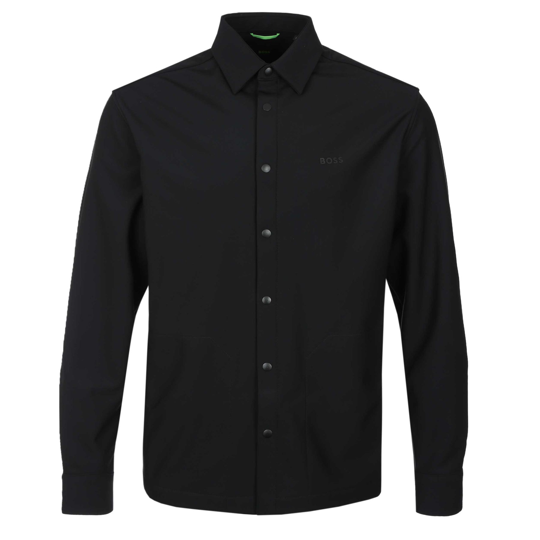 BOSS ST Civic L Tech Overshirt in Black. A relaxed-fit overshirt crafted from an innovative super-stretch tech fabric for comfort and easy movement. It features a full snap-button fastening, a soft pointed collar and square snap cuffs. Finished with a rubberised BOSS chest logo and additional branding on the sleeve for a clean, modern look. A versatile layer built for everyday wear.