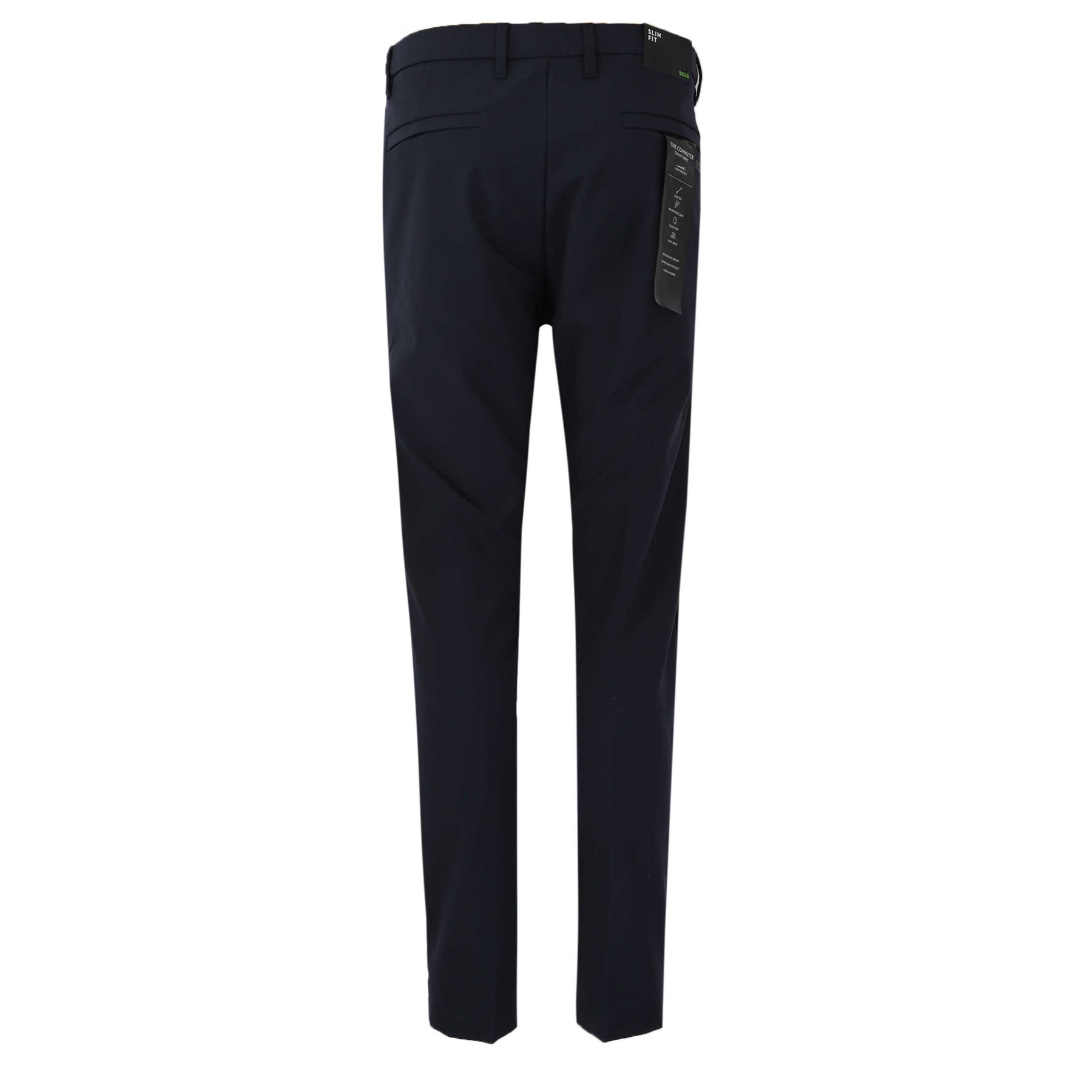 BOSS T Commuter Slim TekCo Trouser in Dark Blue. Trouser by BOSS. A slim fit trouser with a button and zip fastening placket. Hidden drawstrings to the waistband. 4 way stretch properties to add comfort to the trouser. The trouser has water repellent properties. Two slash side pockets and two zip pockets to the seat. Card holder and coin catcher pockets. Printed BOSS logo to the rear of the trouser