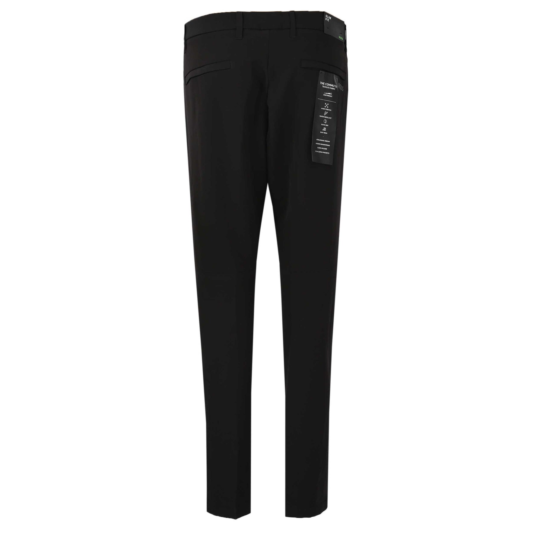 BOSS T Commuter Slim Trouser in Black. Trouser by BOSS. A slim fit trouser with a button and zip fastening placket. Hidden drawstrings to the waistband. 4 way stretch properties to add comfort to the trouser. The trouser has water repellent properties. Two slash side pockets and two zip pockets to the seat. Card holder and coin catcher pockets. Printed BOSS logo to the rear of the trouser