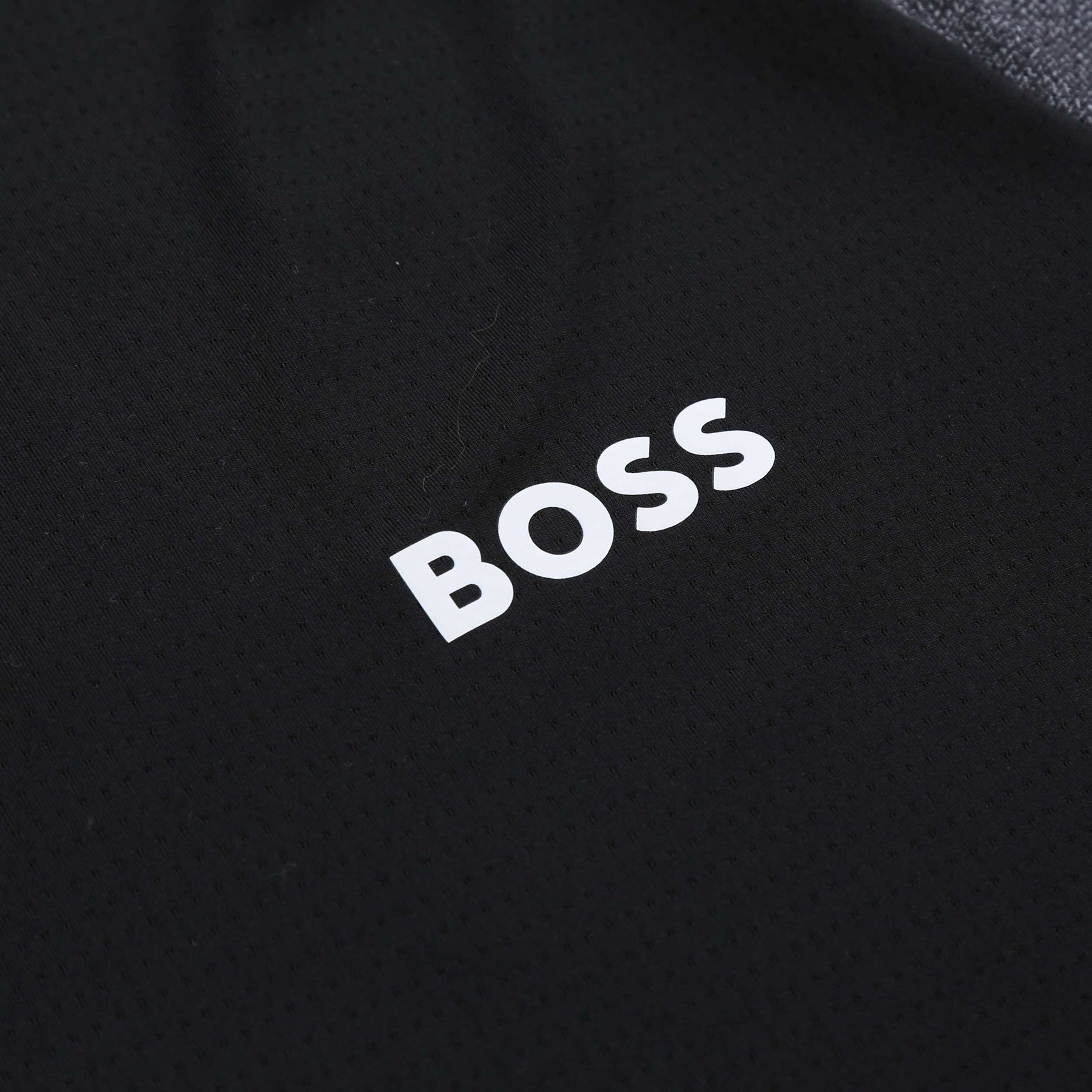 BOSS TS TOC Matchball T Shirt in Black. This slim-fit BOSS performance top is built for movement, combining an all-over perforated fabric with moisture-management, quick-dry technology and full 4-way stretch. Designed with a clean crew neckline and contrasting grey raglan sleeves, it delivers unrestricted mobility and a modern athletic look. Black panel detailing runs down the sides for a streamlined finish. The signature BOSS logo appears on the chest and at the back of the neckline, completing a technical layer made for training, travel and everyday active wear.