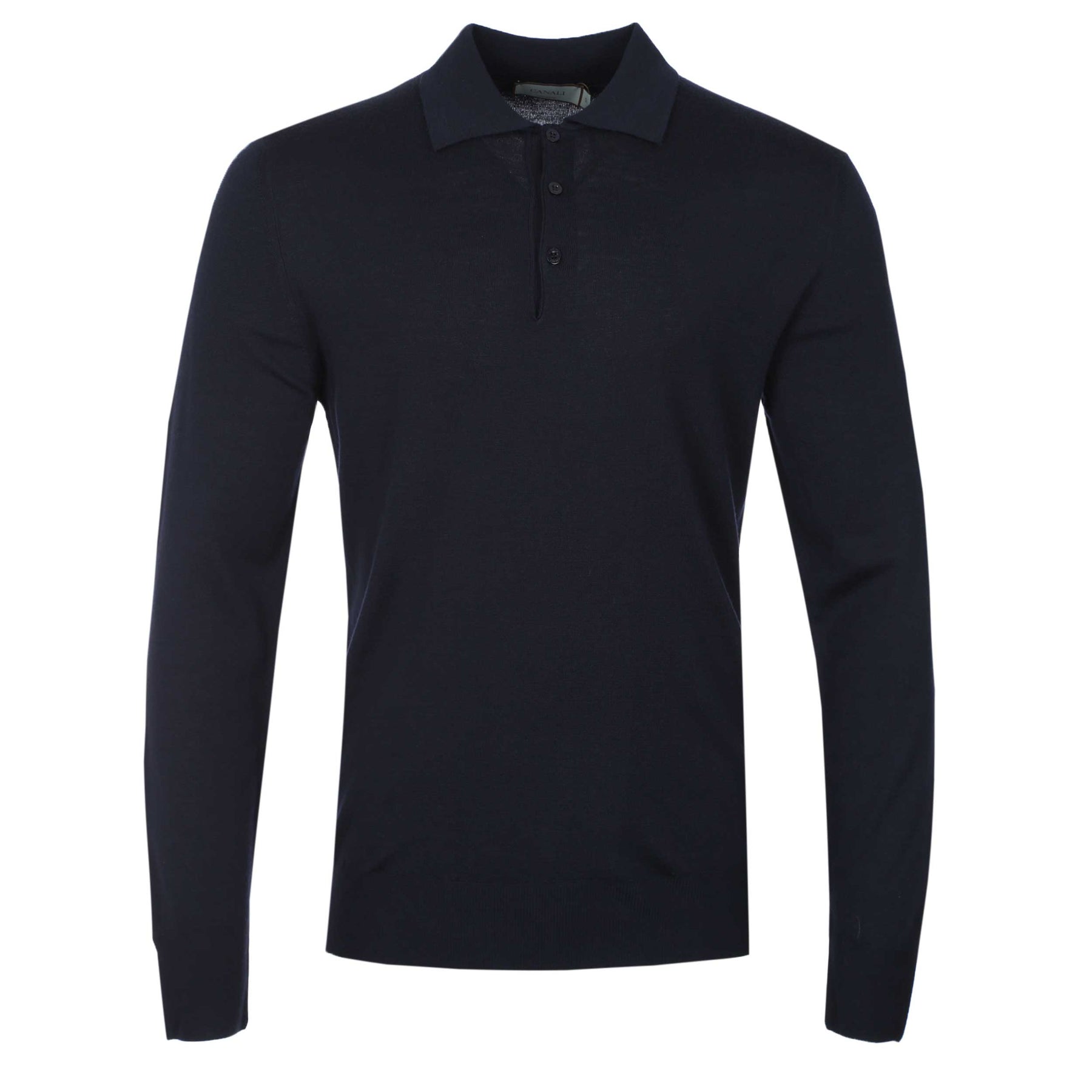 Canali 3 Button Knitted Polo in Navy. Long sleeve knitted polo shirt by Canali in a regular fit. Plain design polo shirt with a 3 button fastening placket. Ribbed collar, cuff and hem. Perfect to be worn on its own or to layer up.