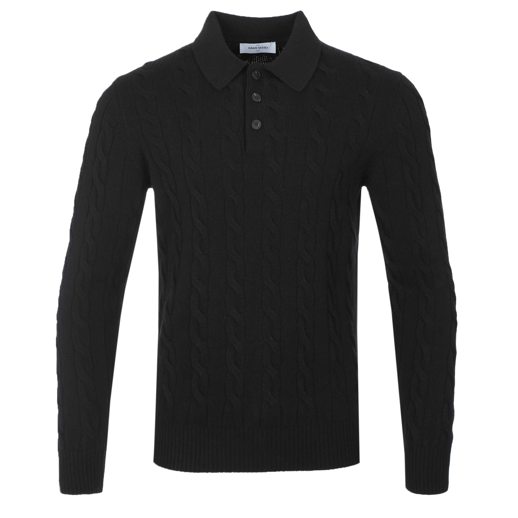 Elevate your winter wardrobe with the exquisite Gran Sasso 3 Button Cable Knitwear in Black. This long-sleeved polo is crafted from pure Italian cashmere and finished in an elegant mix of cable and ribbed knitting for rich texture and warmth. The three-button placket keeps the look refined yet relaxed, making it easy to dress up or down. Soft, lightweight and naturally insulating, it delivers premium comfort with a clean, timeless silhouette. Made in Italy in a regular fit, it’s a standout piece for anyone who wants undeniable quality without sacrificing everyday wearability.