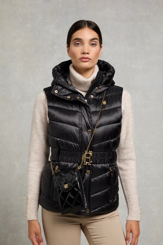 The Holland Cooper Knightsbridge Quilted Ladies Phone Pouch in Black Leather is the epitome of sophistication and functionality. Crafted with precision from premium quilted leather, this phone pouch combines luxury with everyday practicality. Its sleek design is highlighted by the signature gold HC branding, making it a standout accessory for any outfit.
