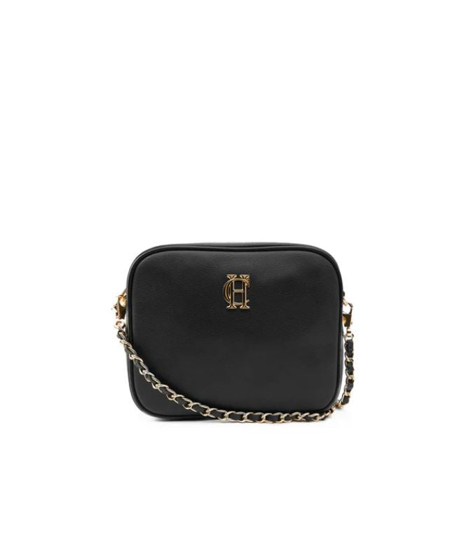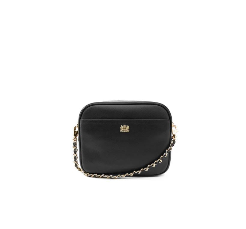 Holland Cooper Soho Camera Bag in Black. This bag arrives in a classic camera bag style. It has an intertwined chain and leather shoulder strap. One large main compartment. Detailed with signature Holland Cooper gold branding. Quilted design throughout the bag. This bag comes in a Holland Cooper green box and dust bag.