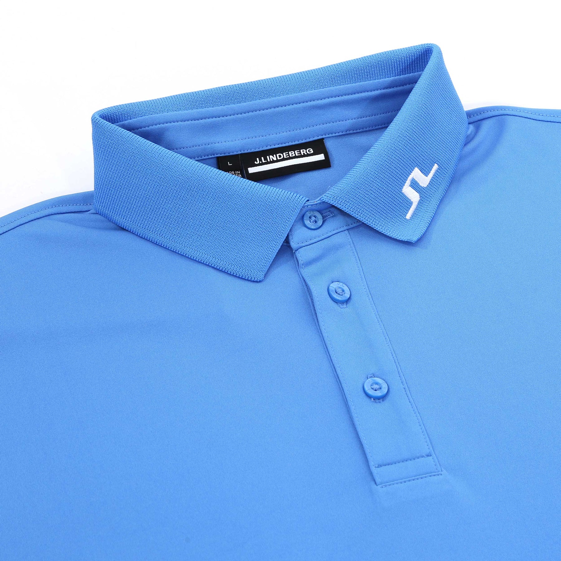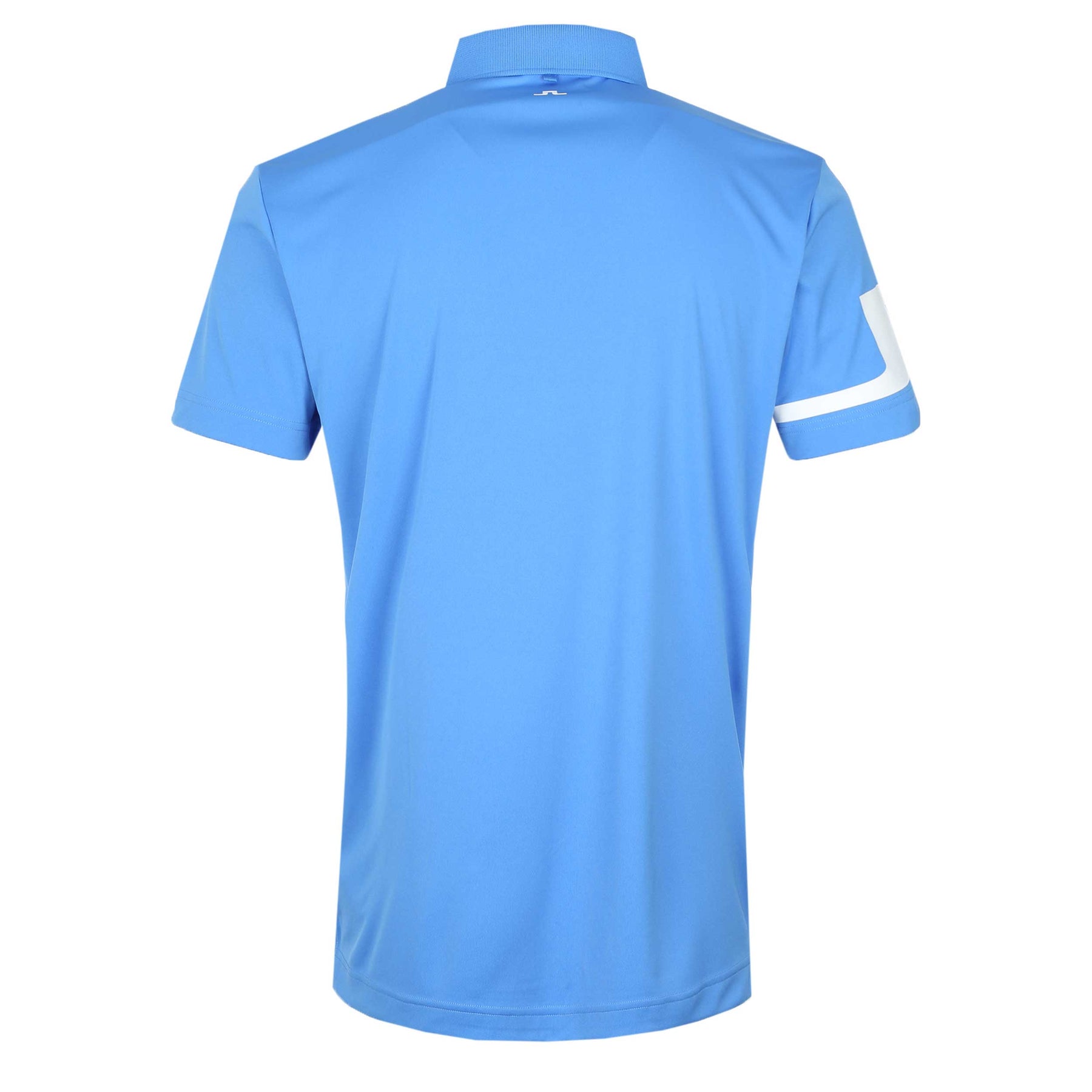 J.Lindeberg Heath Polo Shirt in Sonic Blue. A regular fit polo shirt by J.Lindeberg. This polo shirt is constructed from a stretchable TX jersey fabric. This lightweight polo shirt has moisture-wicking technology and 4 way stretch properties. 3 button fastening placket with a flat knit collar. Embroidered J.Lindeberg logo to the collar. Large printed logo to the right sleeve.