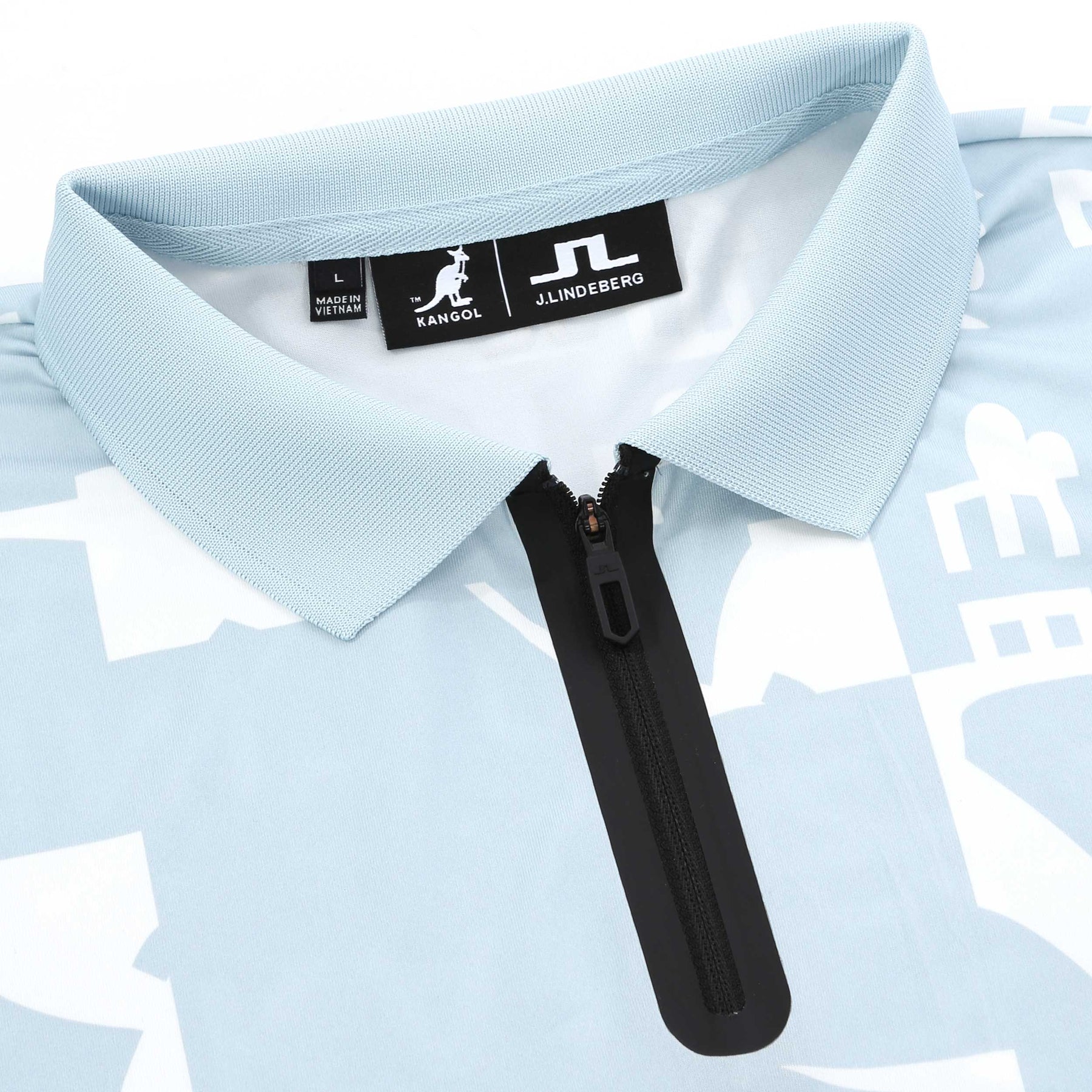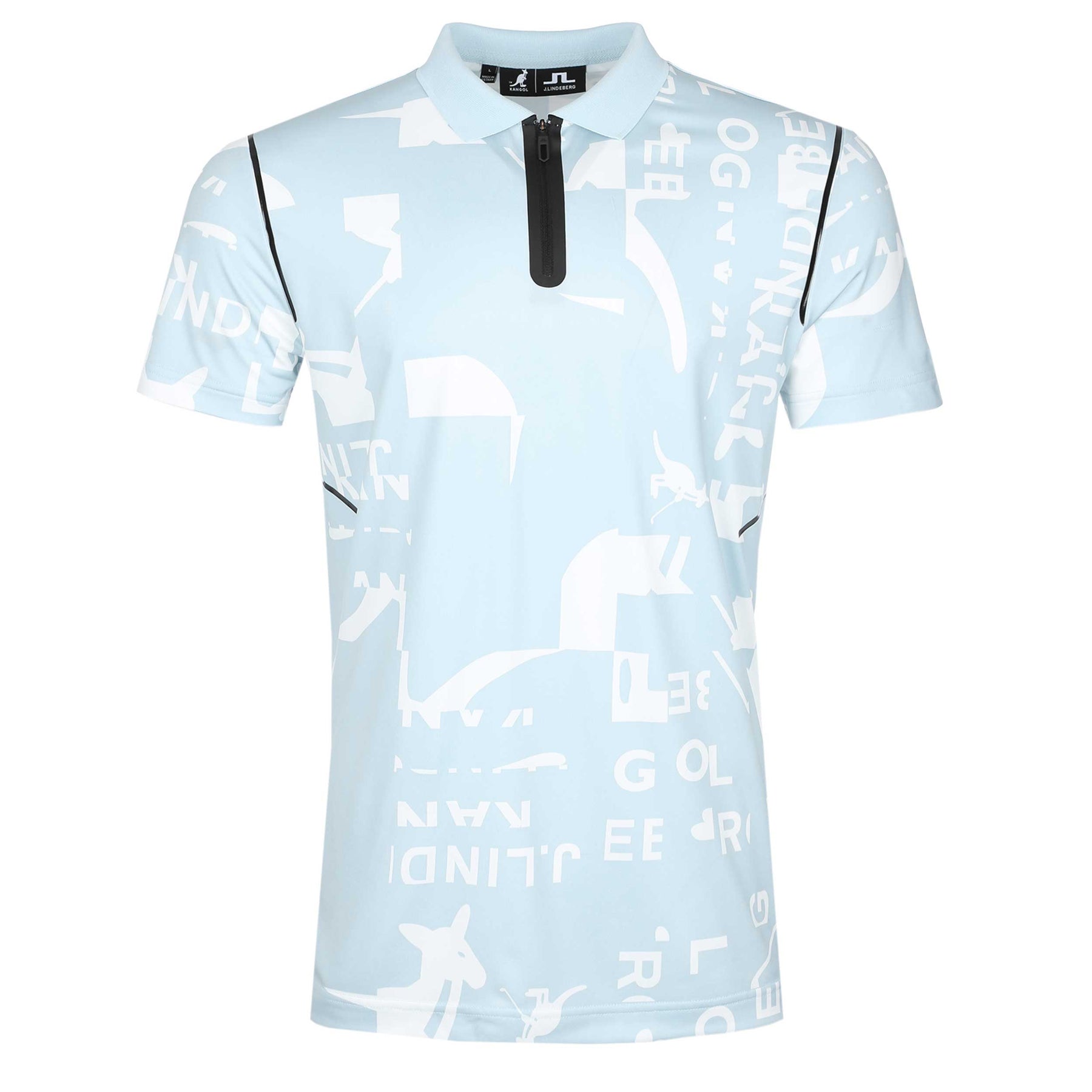 J.Lindeberg Miro Print Polo Shirt in Kangol WinterSky White. A regular fit polo shirt by J.Lindeberg. This polo shirt is constructed from a stretchable TX jersey fabric. This lightweight polo shirt has moisture-wicking technology and 4 way stretch properties. J.Lindeberg x Kangol print throughout the polo shirt. Zip fastening placket with a flat knit collar. Ribbed collar. J.Lindeberg rubber logo to the nape of the polo shirt.