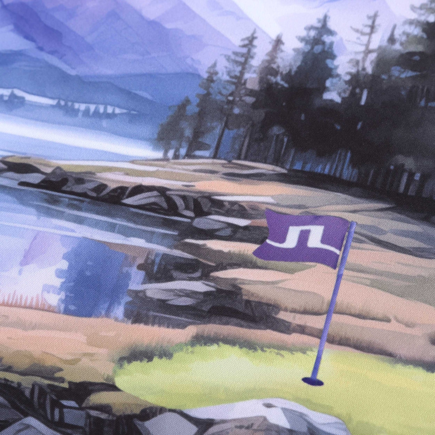 J.Lindeberg Samuel Polo Shirt in Landscape Watercolour Purple. A regular fit polo shirt by J.Lindeberg. This lightweight polo shirt has moisture-wicking technology and 4 way stretch properties. Bold seasonal print design in a watercolour design. 3 button fastening placket with a flat knit collar. Rubber J.Lindeberg logo to the collar and nape of the polo shirt.