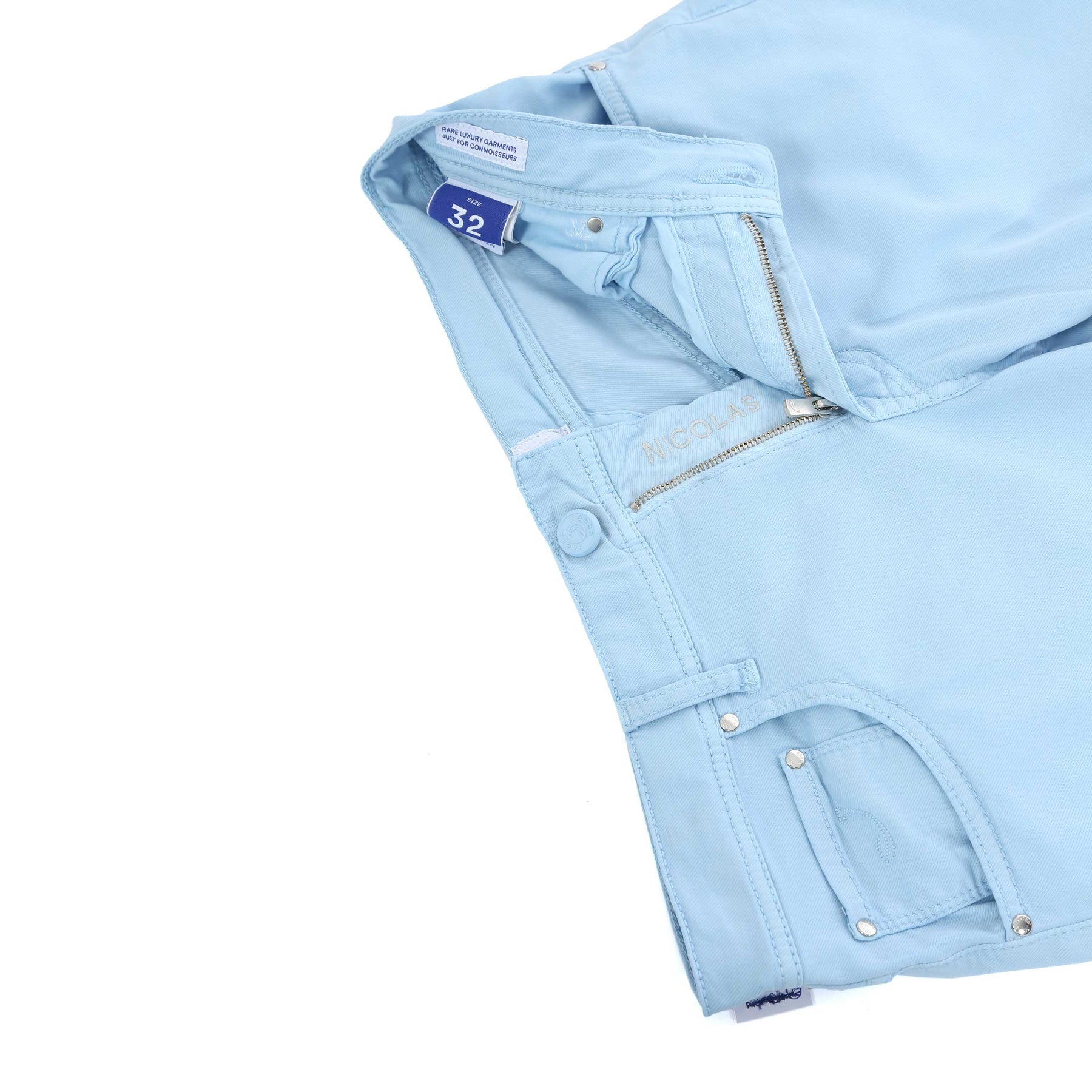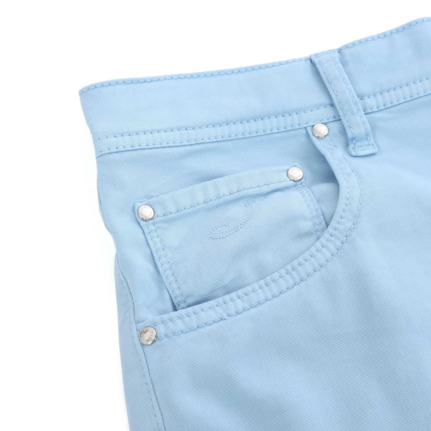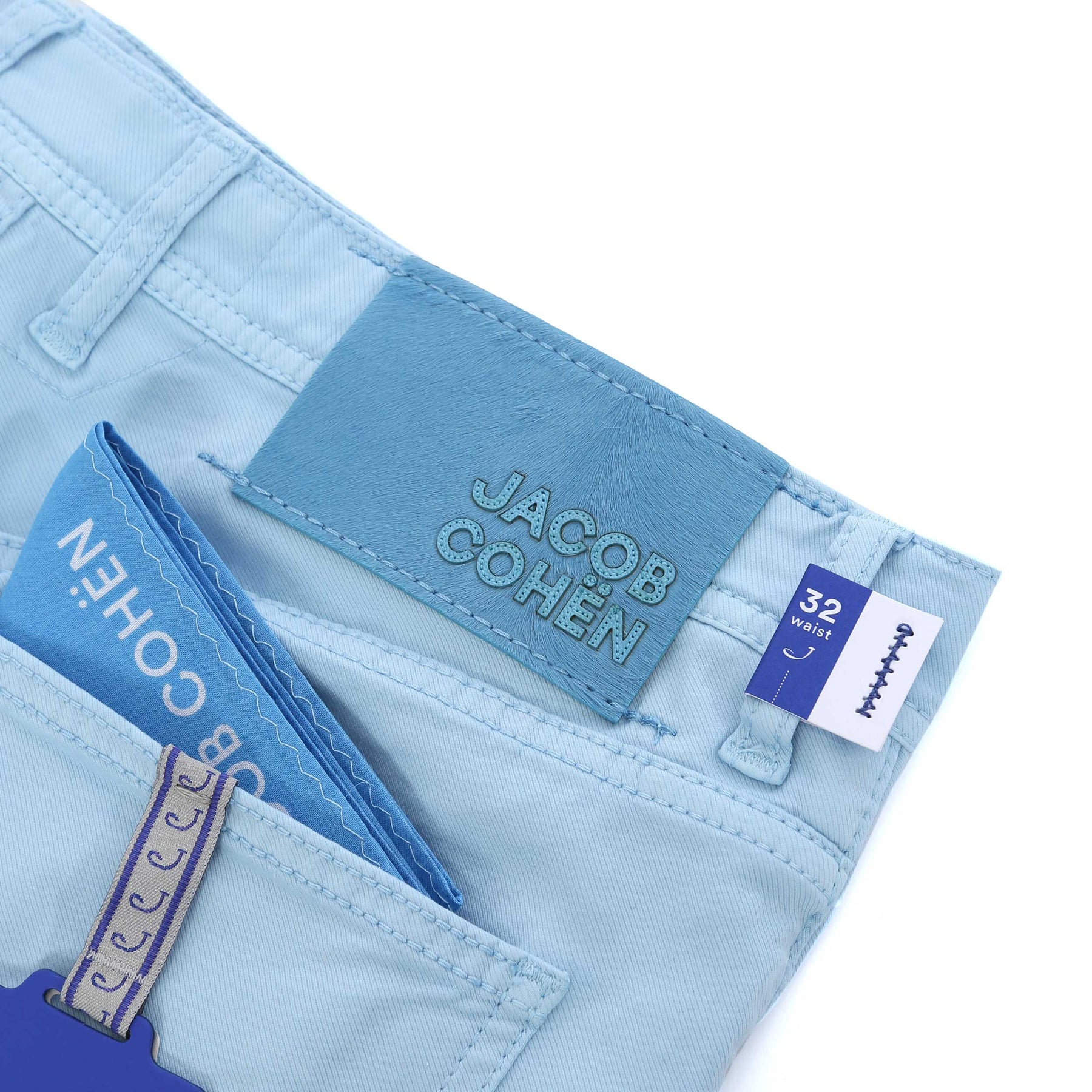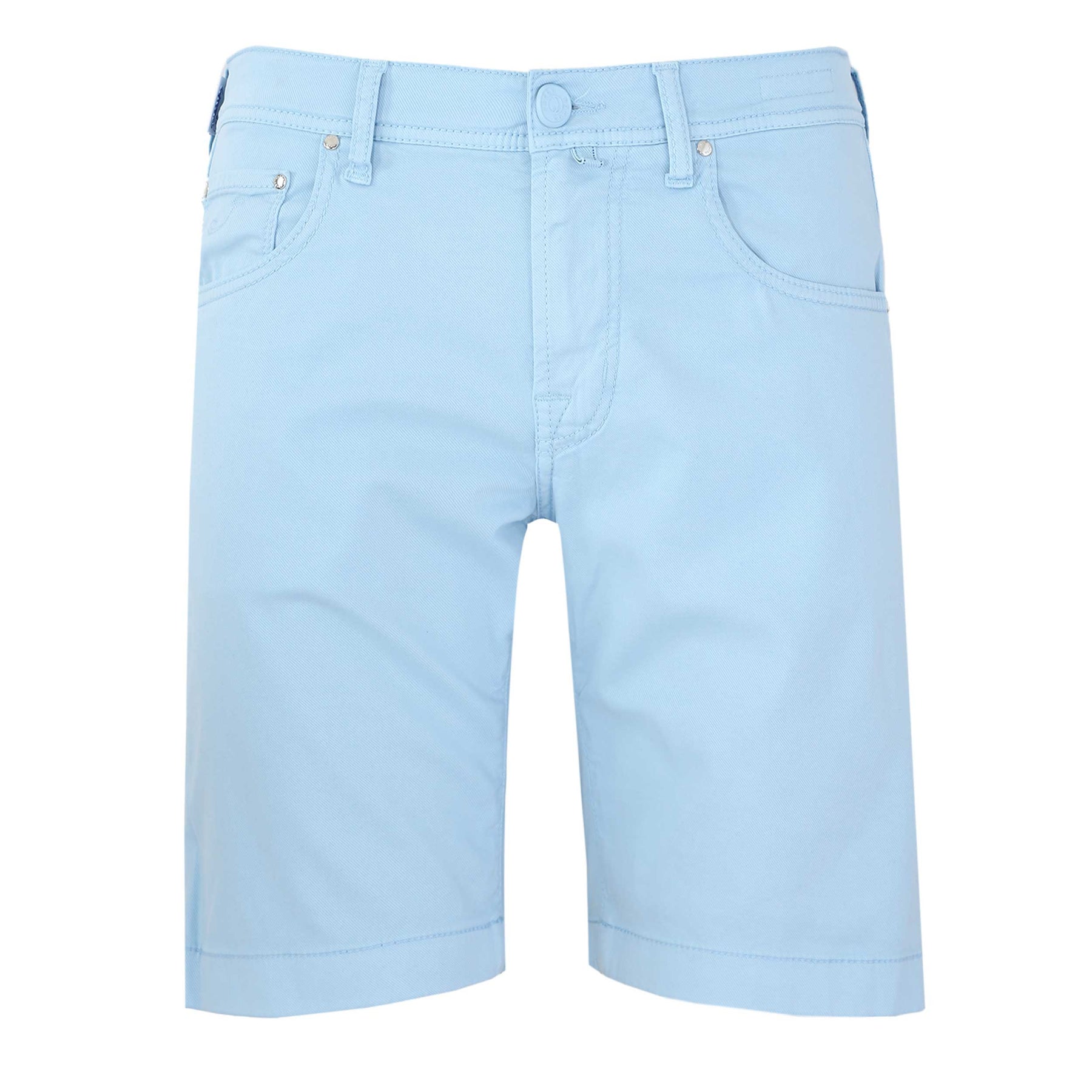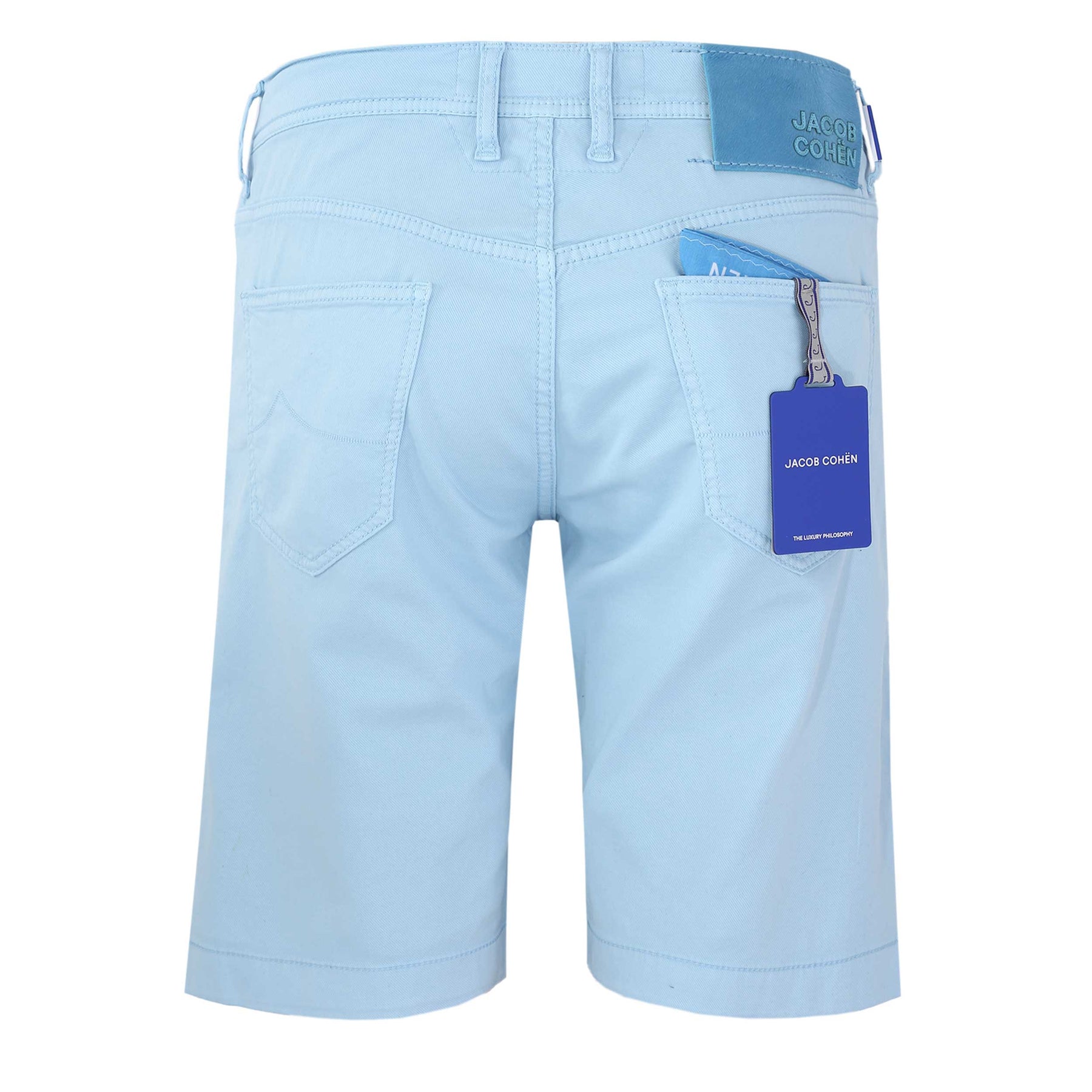 Jacob Cohen Nicholas Short in Sky Blue. A high quality, cotton blend short by Jacob Cohen. They feature a 5 pocket jean style and a Jacob Cohen brand badge to the rear. Button and fly zip fastening. Tonal horse hair logo badge to the waistband.