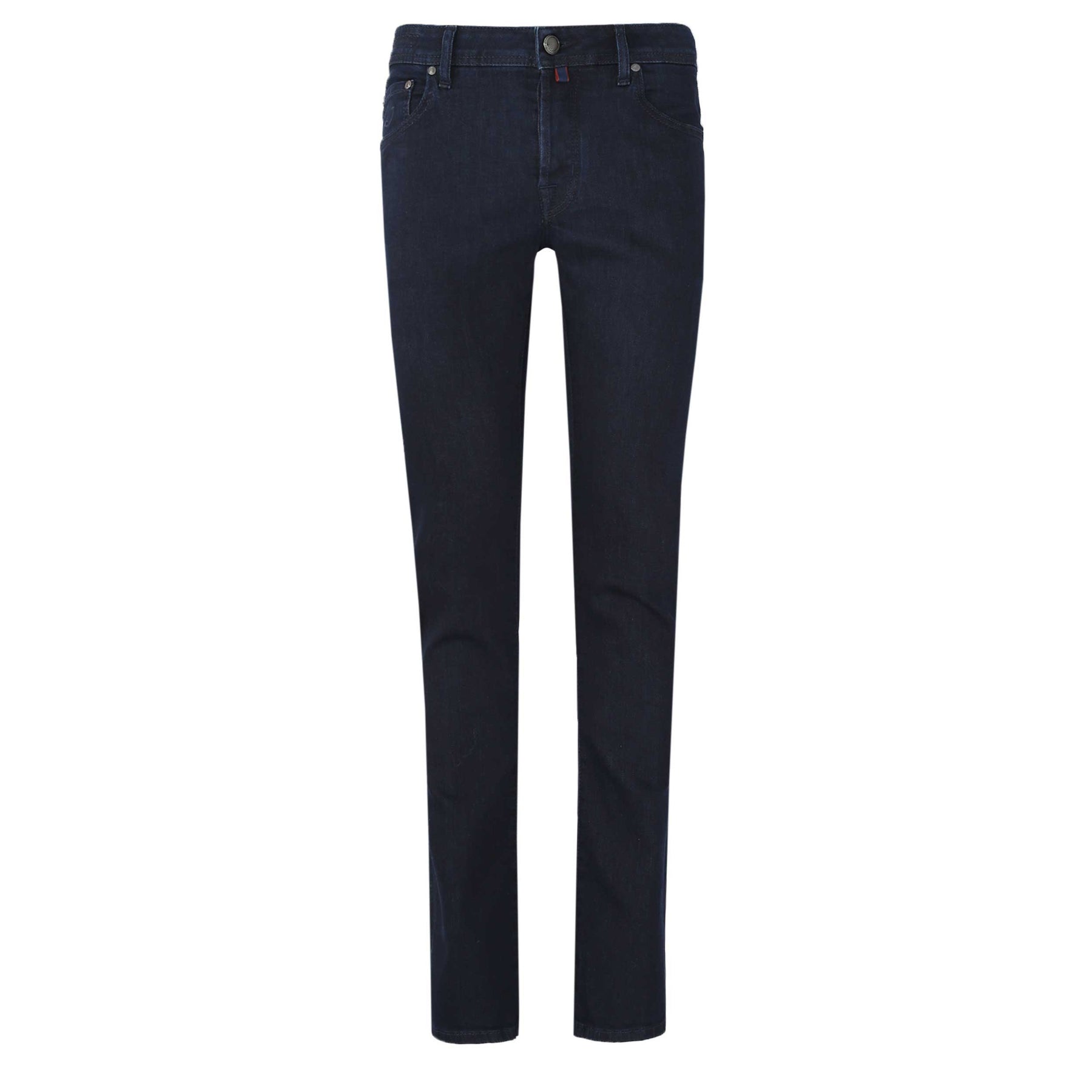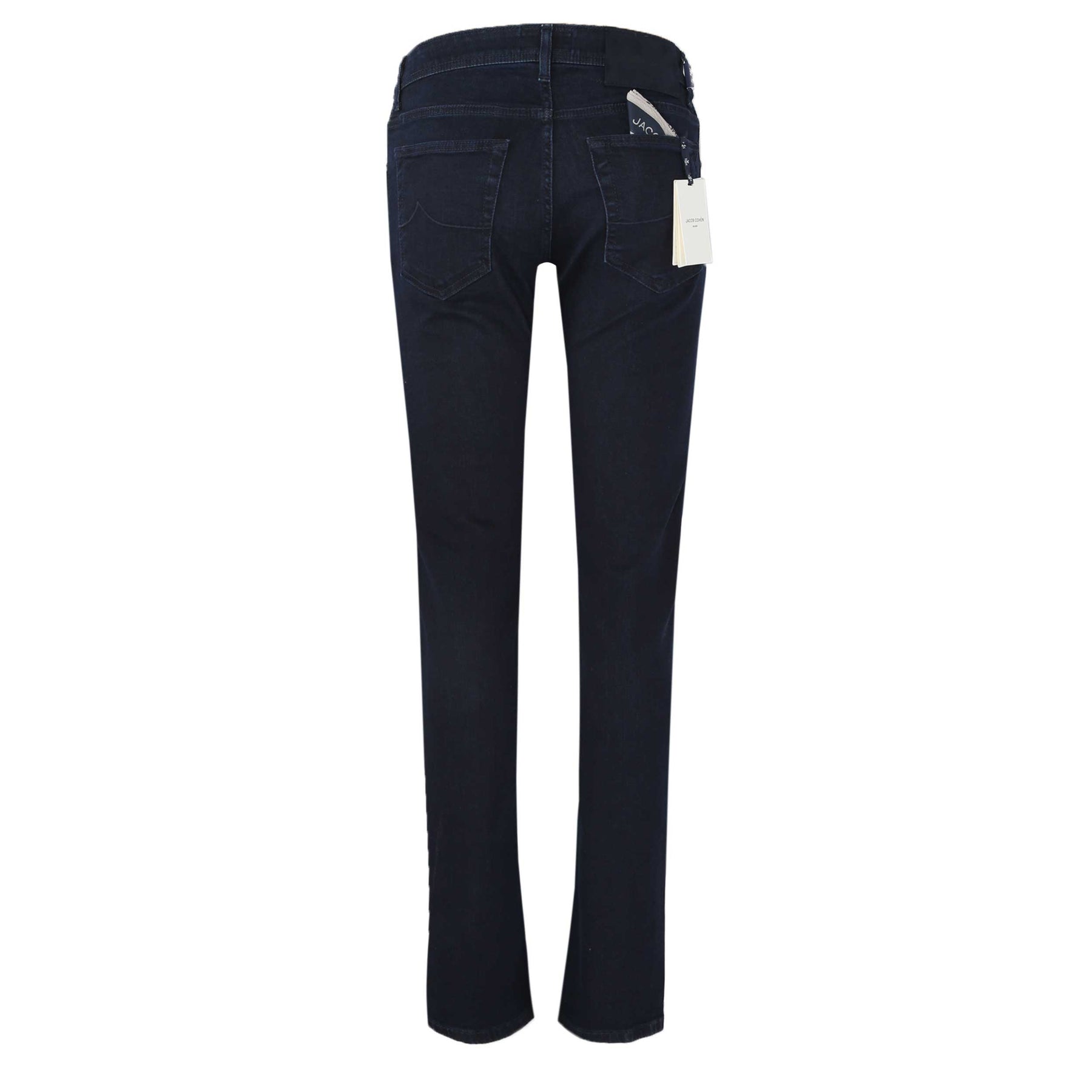 Jacob Cohen Nick Navy Blue Badge Jean in Dark Blue Denim. A high quality jean by Jacob Cohen. A 5 pocket jean style, featuring a button fly fastening with branded button detailing. A dark blue hand sanded denim. Finished with a navy blue Jacob Cohen badge on the rear.