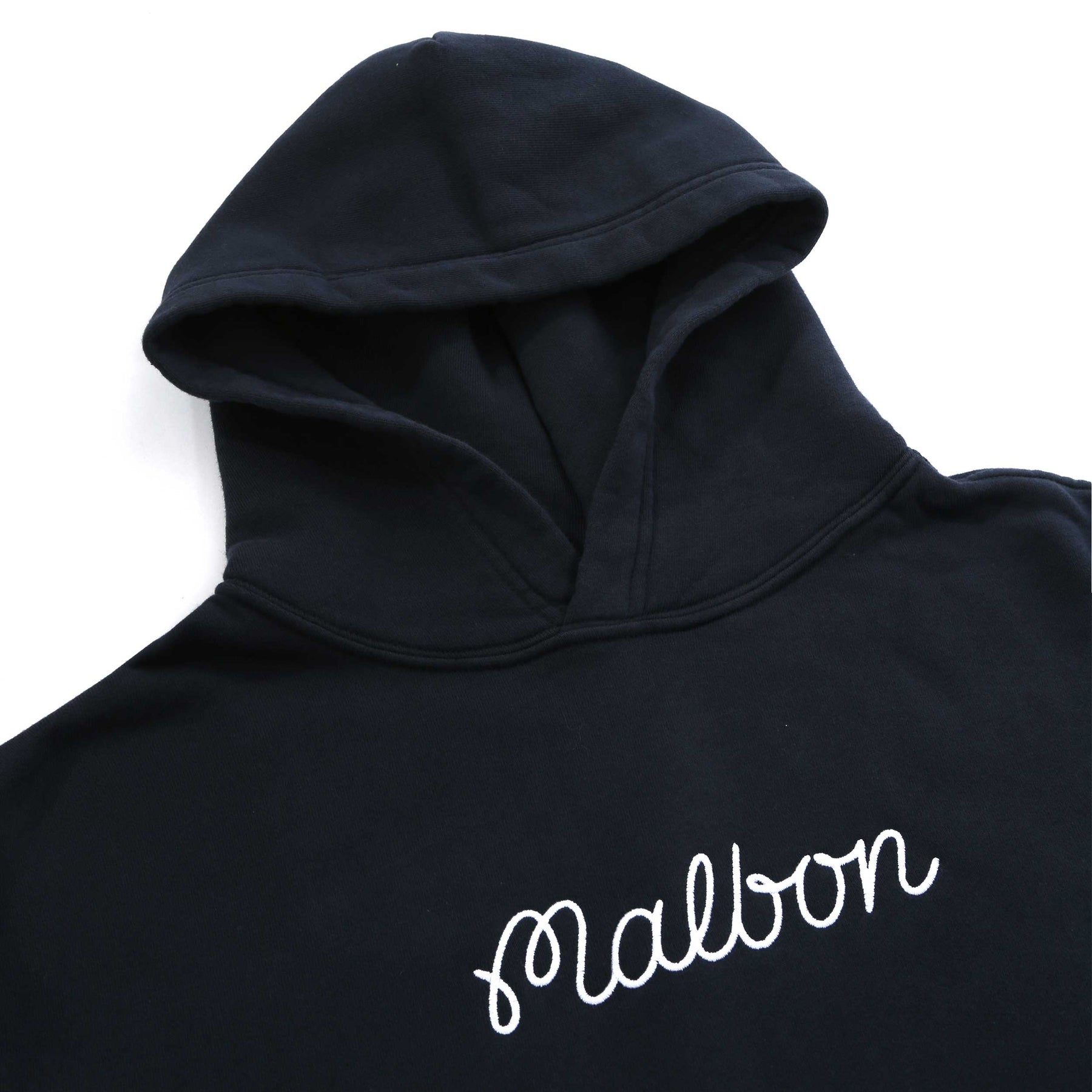 Malbon Fesque Hoodie Sweatshirt in Navy. Hoodie sweatshirt by Malbon. This over the head sweatshirt has a contrasting Malbon script logo embroidered to the chest and right cuff. Kangaroo pocket to the front. Ribbed cuff and waistband.
