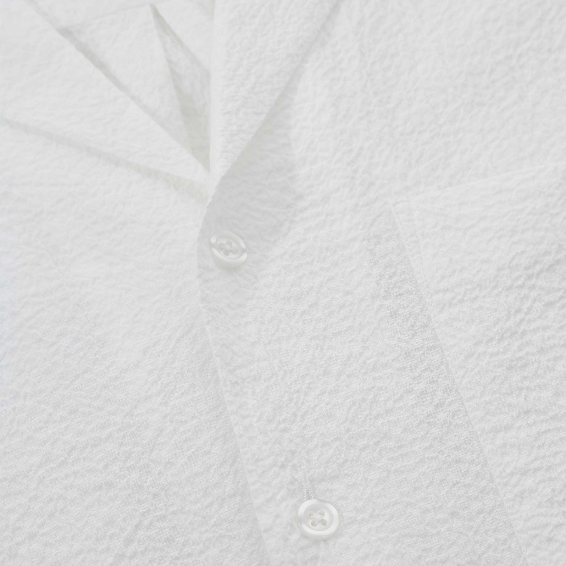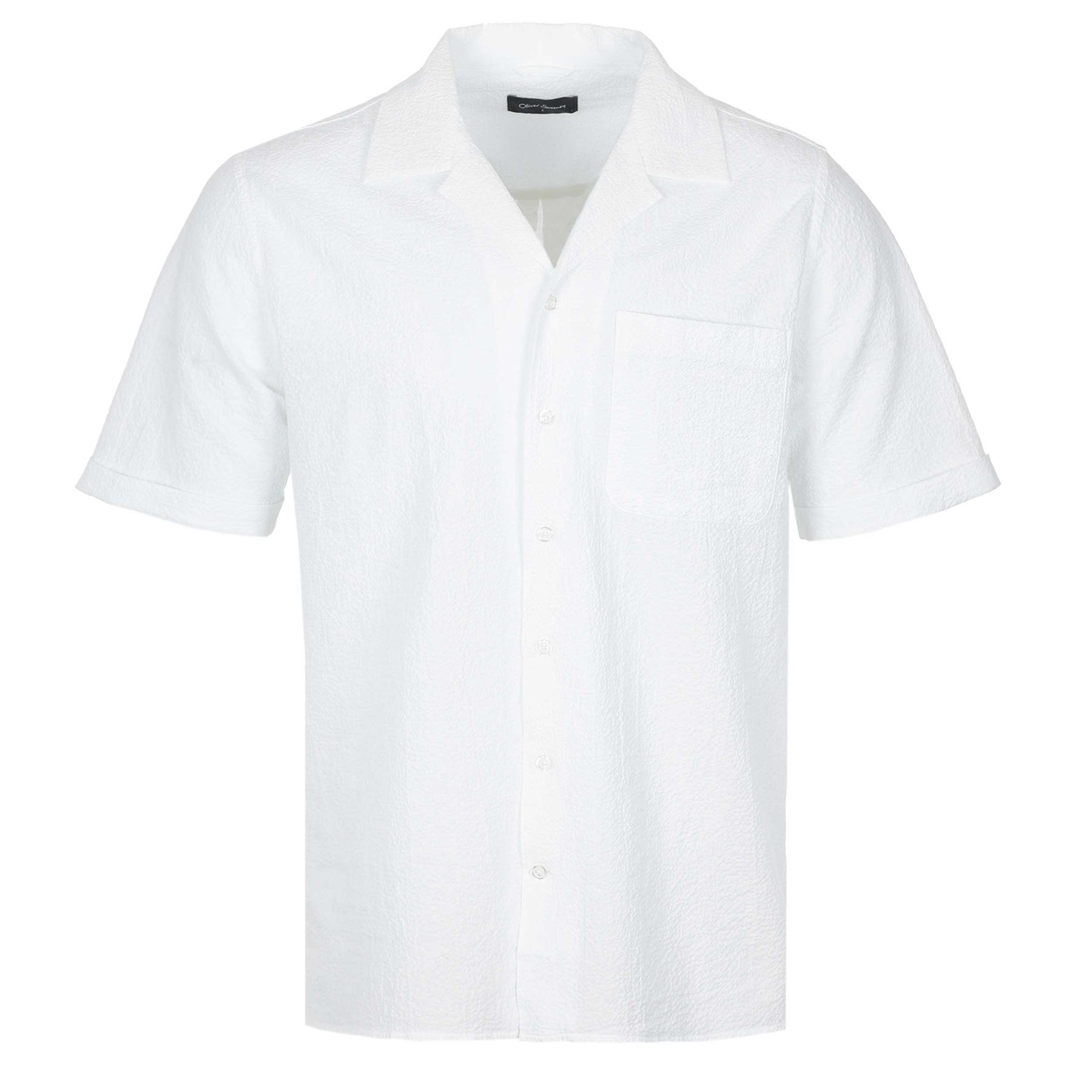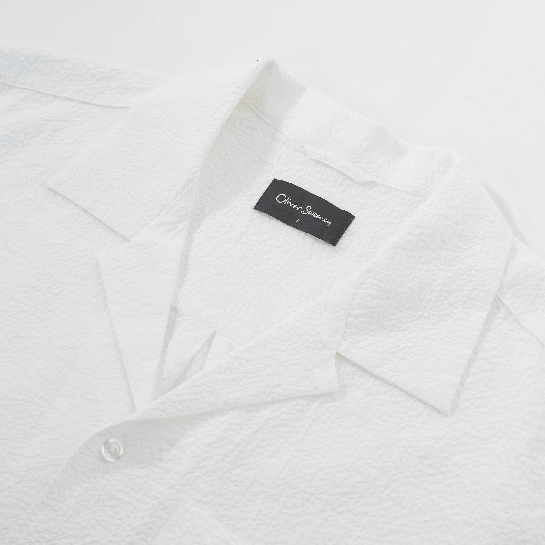 Oliver Sweeney Ravenshead SS Shirt in Off White. A casual short sleeve shirt constructed from a cotton mix. A seersucker shirt with a full button fastening placket. Turned up sleeves and a chest pocket. Soft cuban style collar. Perfect on its own or layer up with a t-shirt or jacket.