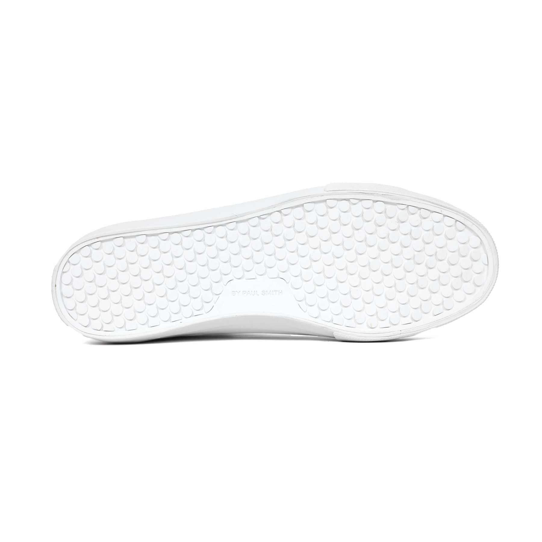 Paul Smith Amos Trainer in White. A premium trainer by Paul Smith. Plain leather trainer. Paul Smith branding to the heel of the sole unit and side panel of the trainer. Tonal rubber sole unit. Classic Paul Smith multicoloured branding to the aglet of the lace. Perfect for everyday wear.