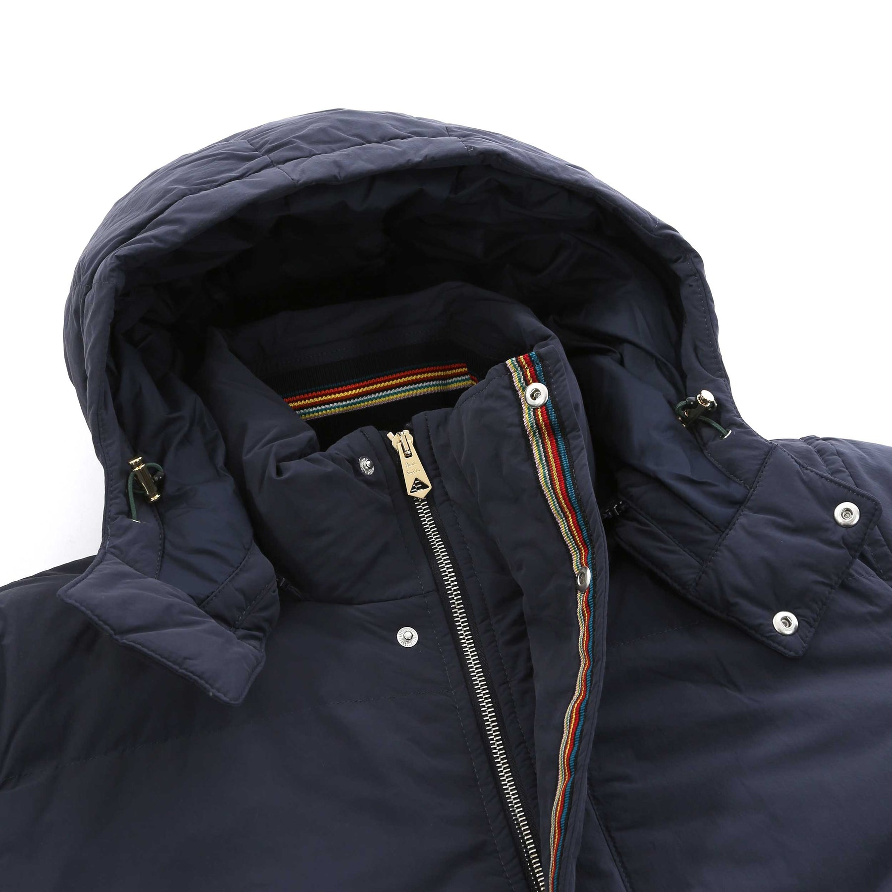 Paul Smith Hooded Down Jacket in Navy. Crafted from a lightweight polyamide shell, this navy long parka delivers reliable protection against wind and rain thanks to its water-repellent finish. Filled with insulating down for superior warmth without bulk, it’s designed to keep you comfortable in colder conditions. A detachable hood adds versatile styling and extra defence from the elements, while the clean, modern silhouette makes it an ideal outerwear choice for both city wear and weekend escapes.