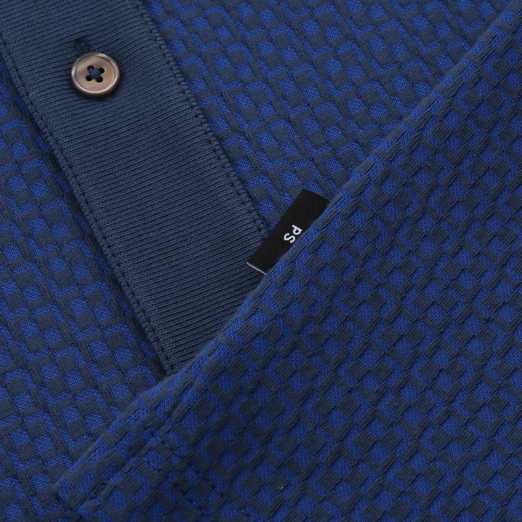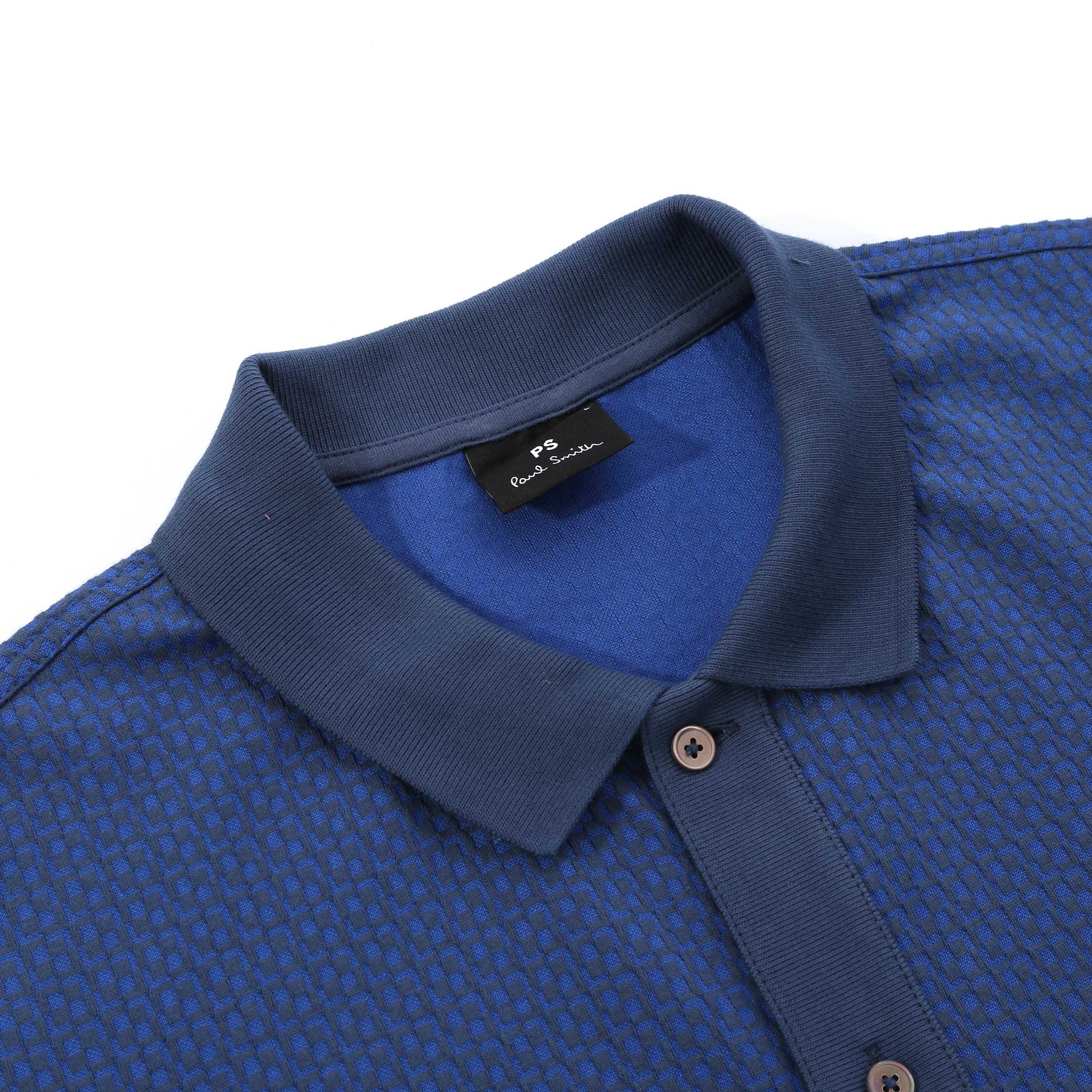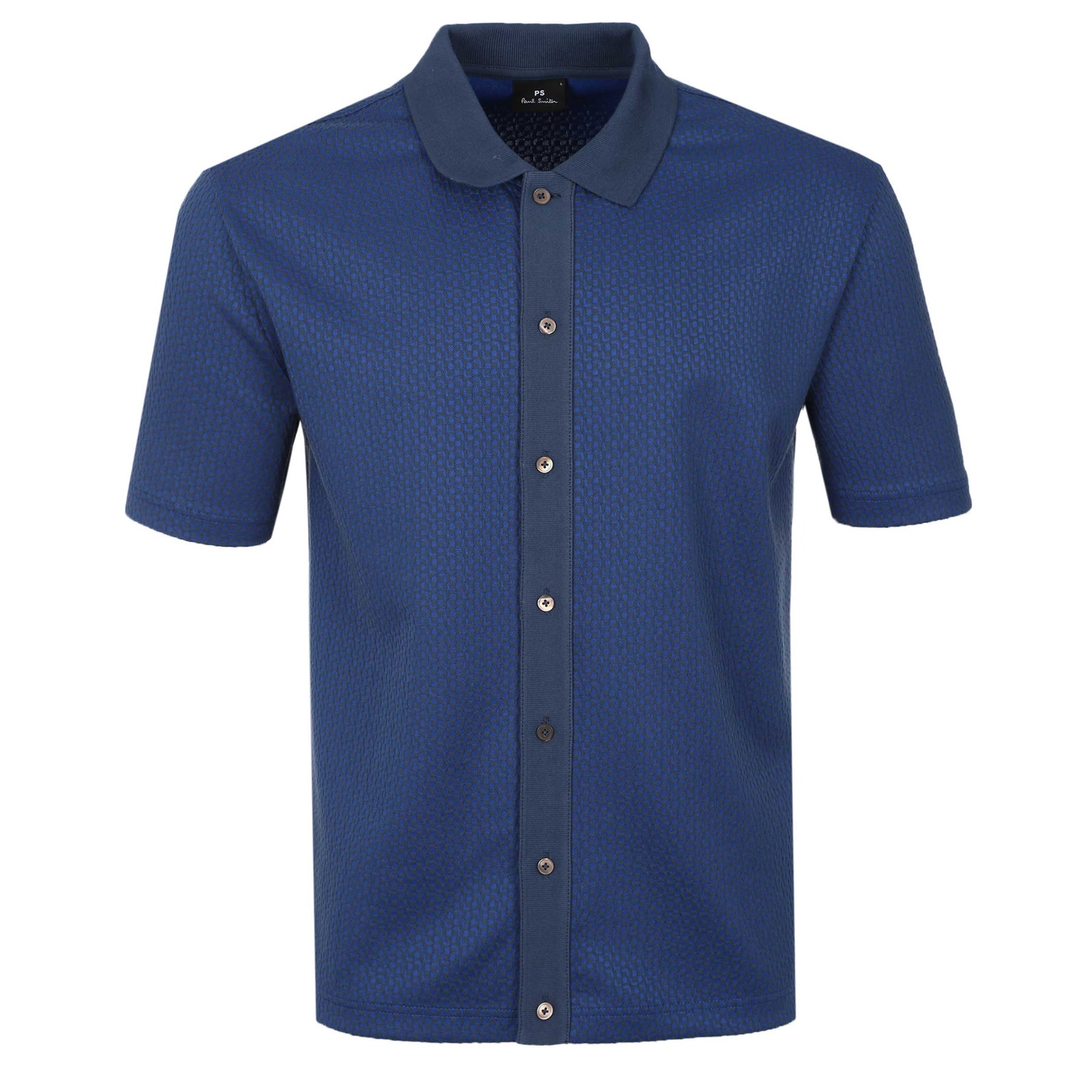 Paul Smith Button Front Polo Shirt in Blue. The PS Paul Smith Reg Fit Button Front Polo Shirt in Blue arrives blending everyday wearability with elevated detail. Crafted from a soft cotton-blend jersey, it features a textured finish with a subtle pattern throughout for added depth and visual interest. Designed in a regular fit, this short-sleeve polo is finished with a tonal ribbed collar, split side vents for comfort, and a full-length button placket that sharpens the silhouette. A discreet side-seam tag adds a final understated nod to Paul Smith’s signature attention to detail. A versatile polo shirt that works effortlessly with tailoring, denim, or summer layers.