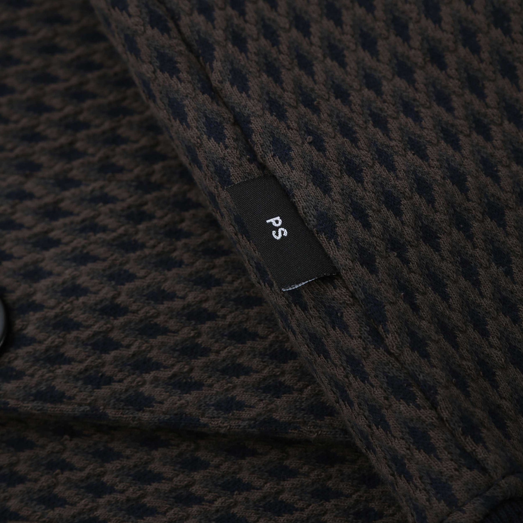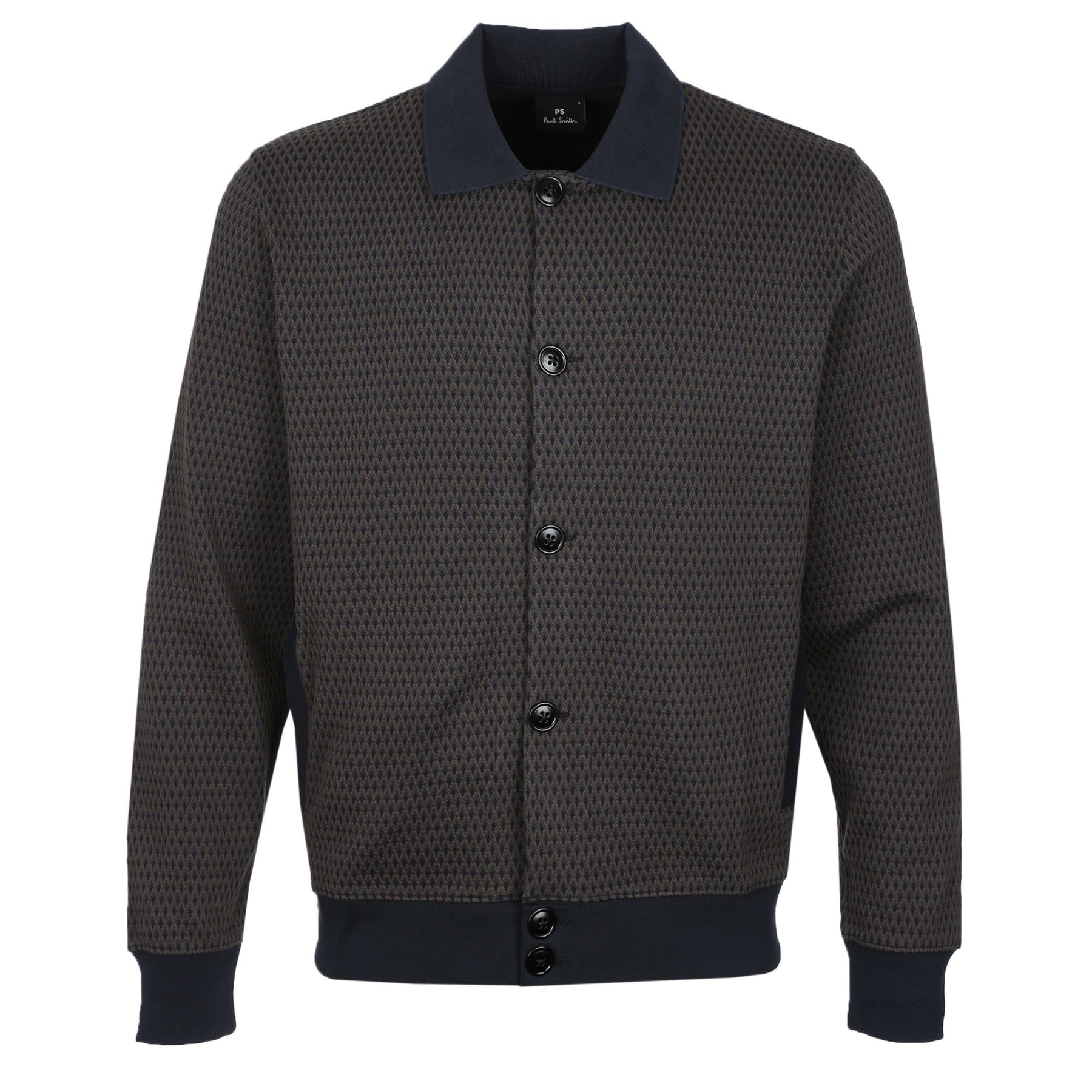 Introducing the Paul Smith Reg Fit Cardigan Sweat in a timeless black, where style meets comfort. This cardigan redefines casual elegance, making it a must-have for any wardrobe. Crafted with meticulous attention to detail, it features a distinctive all-over geometric diamond design that sets it apart from ordinary knitwear.