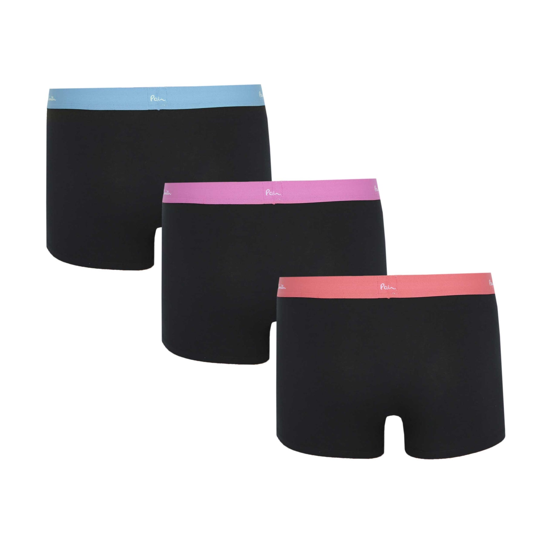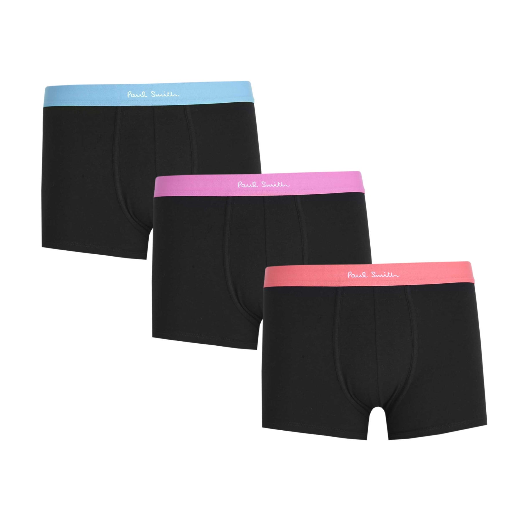 Paul Smith Trunk 3 Pack Underwear in Black. Boxer trunks by Paul Smith. These Paul Smith boxers are designed with stretch for comfort, and come with the distinctive Paul Smith colour stripe design to the waistband. This 3 pack arrives with 3 solid colour boxershorts