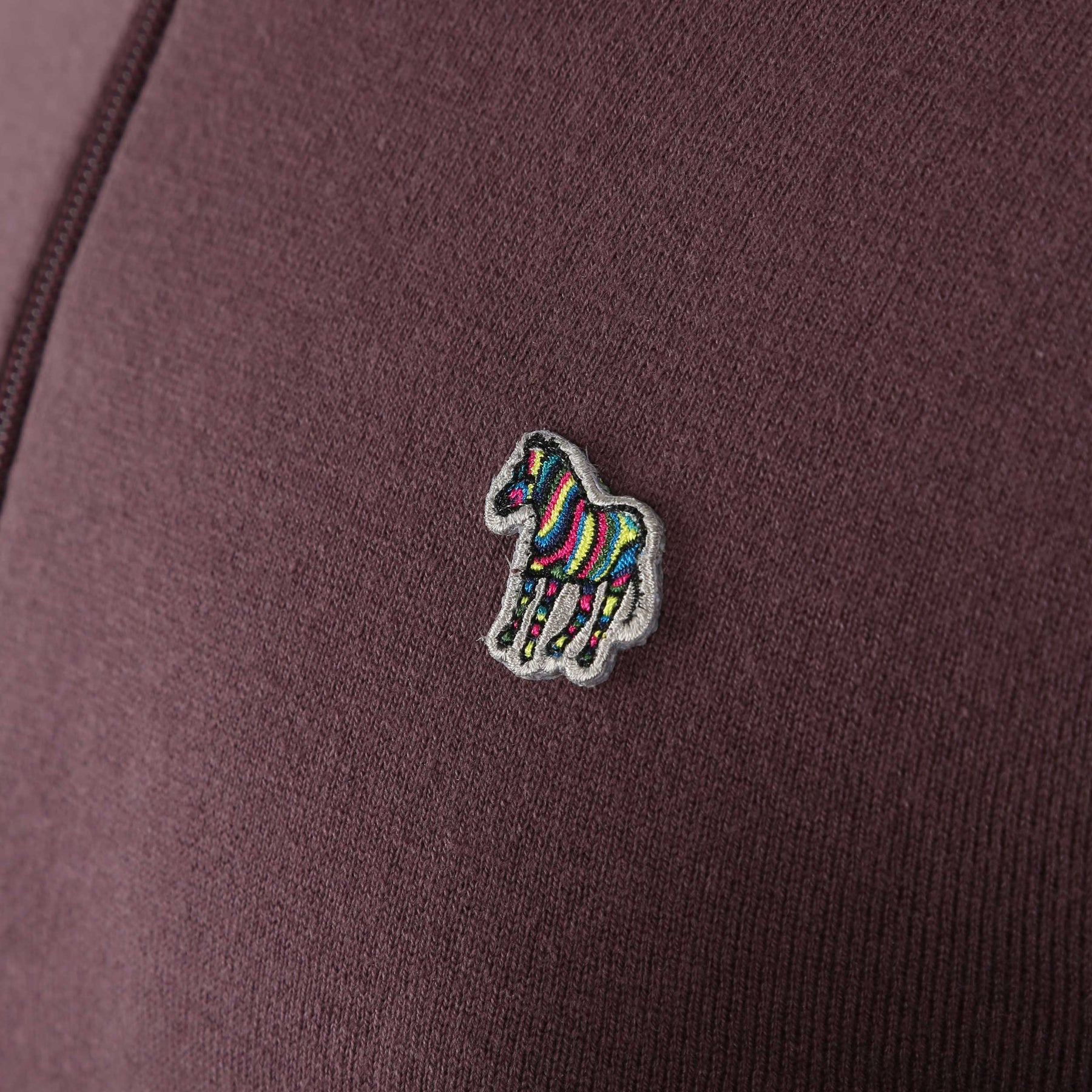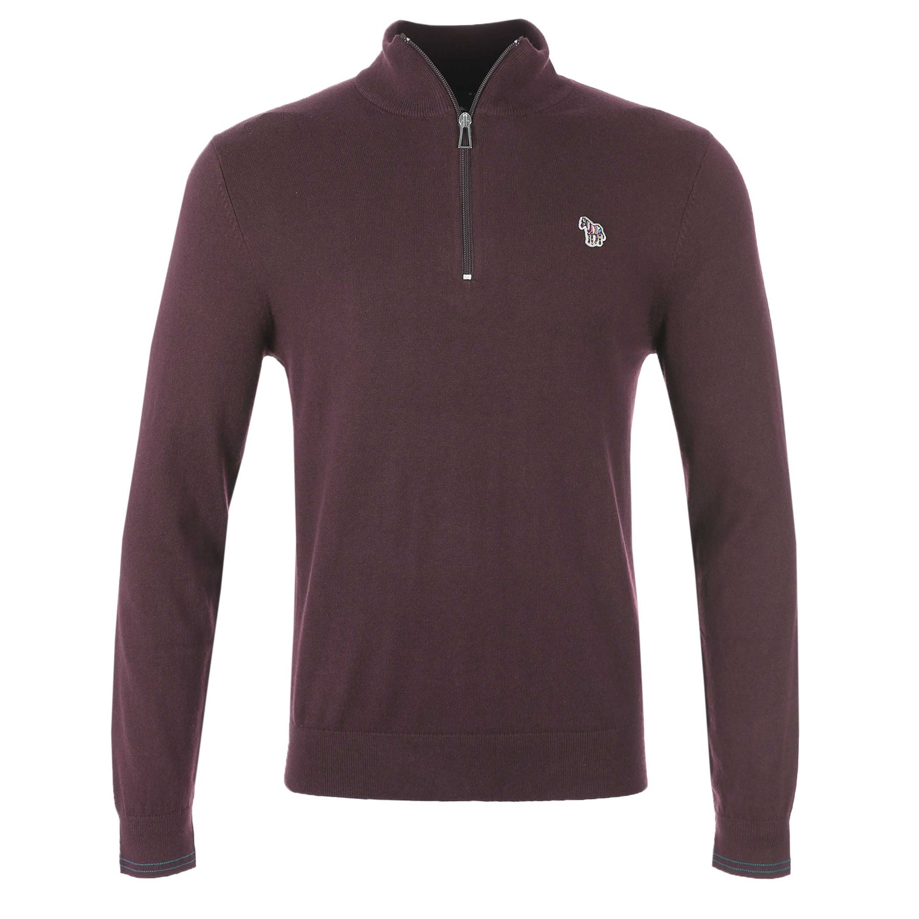 Paul Smith Zip Neck Zeb Bad Knitwear in Plum. A classic knitwear by Paul Smith. Featuring long sleeves, a funnel neck and half zip fastening. Finished with a ribbed waistband and cuffs, and a striped zebra logo on the chest in a multi-colour pattern. Perfect for everyday wear.