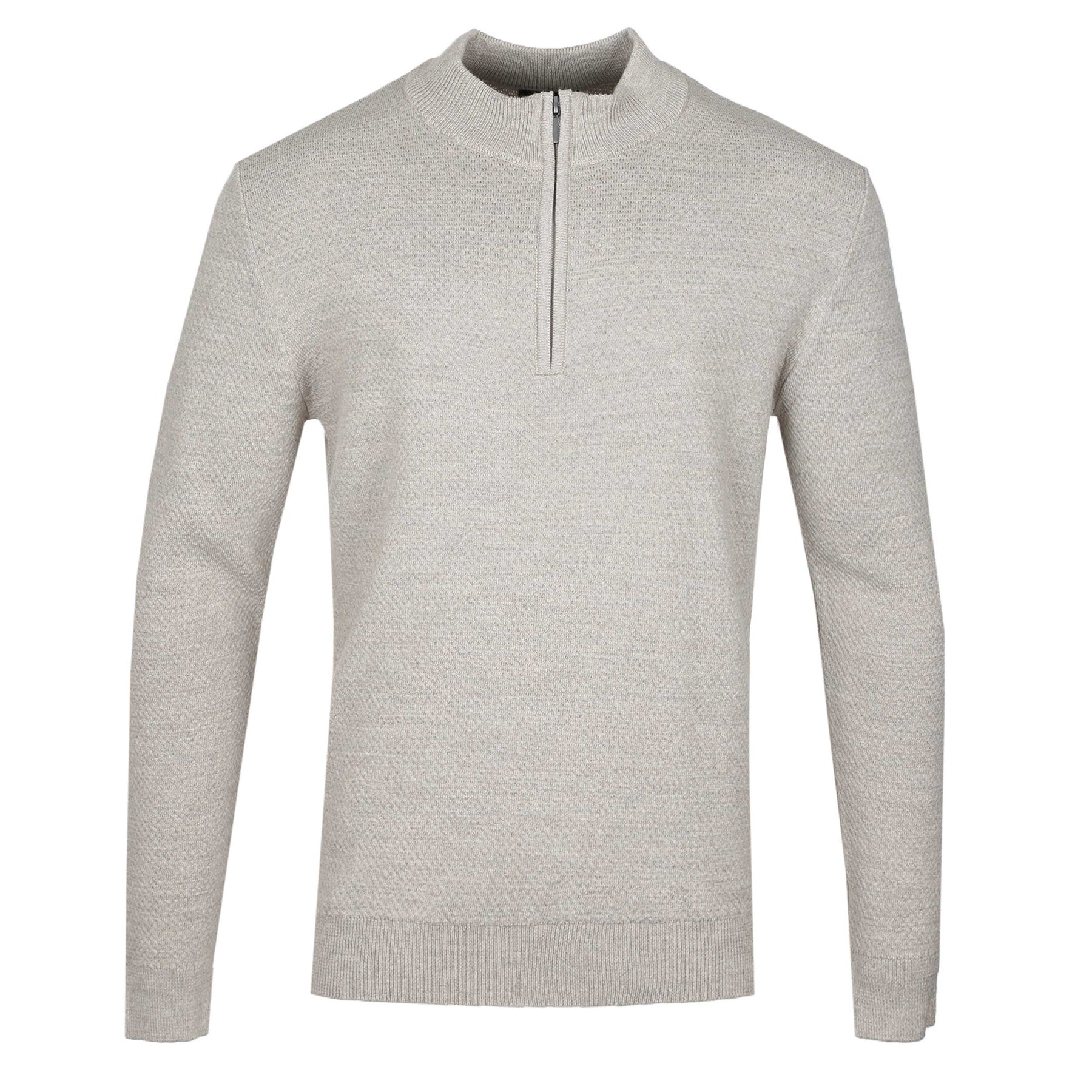 Remus Uomo Waffle Quarter Zip Knitwear in Beige. Long sleeve knitwear by Remus Uomo in a slim fit. Waffle-textured knit structure knitwear with a quarter zip fastening placket. Ribbed collar, cuffs and waistband. Ideal knitwear to layer up underneath a jacket.