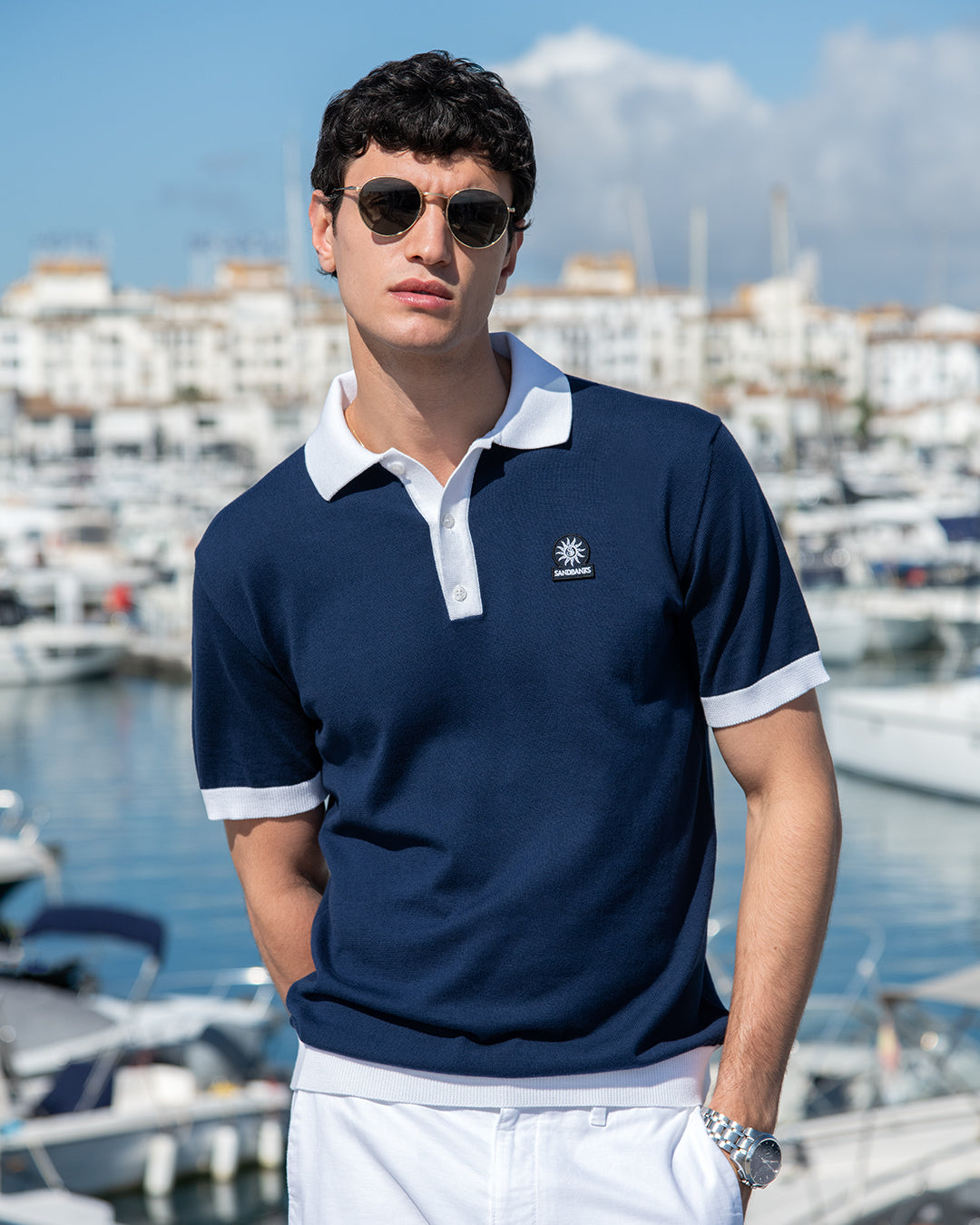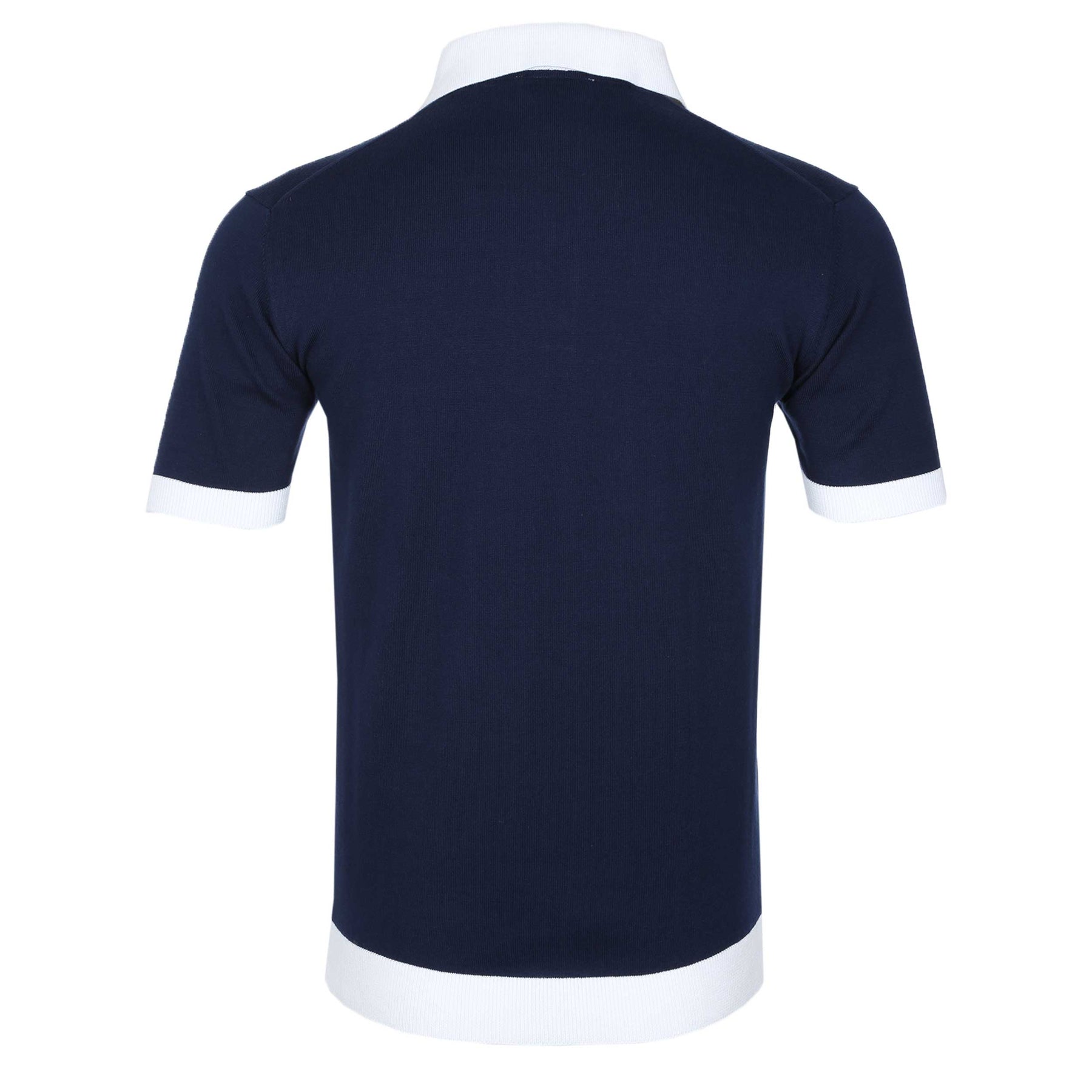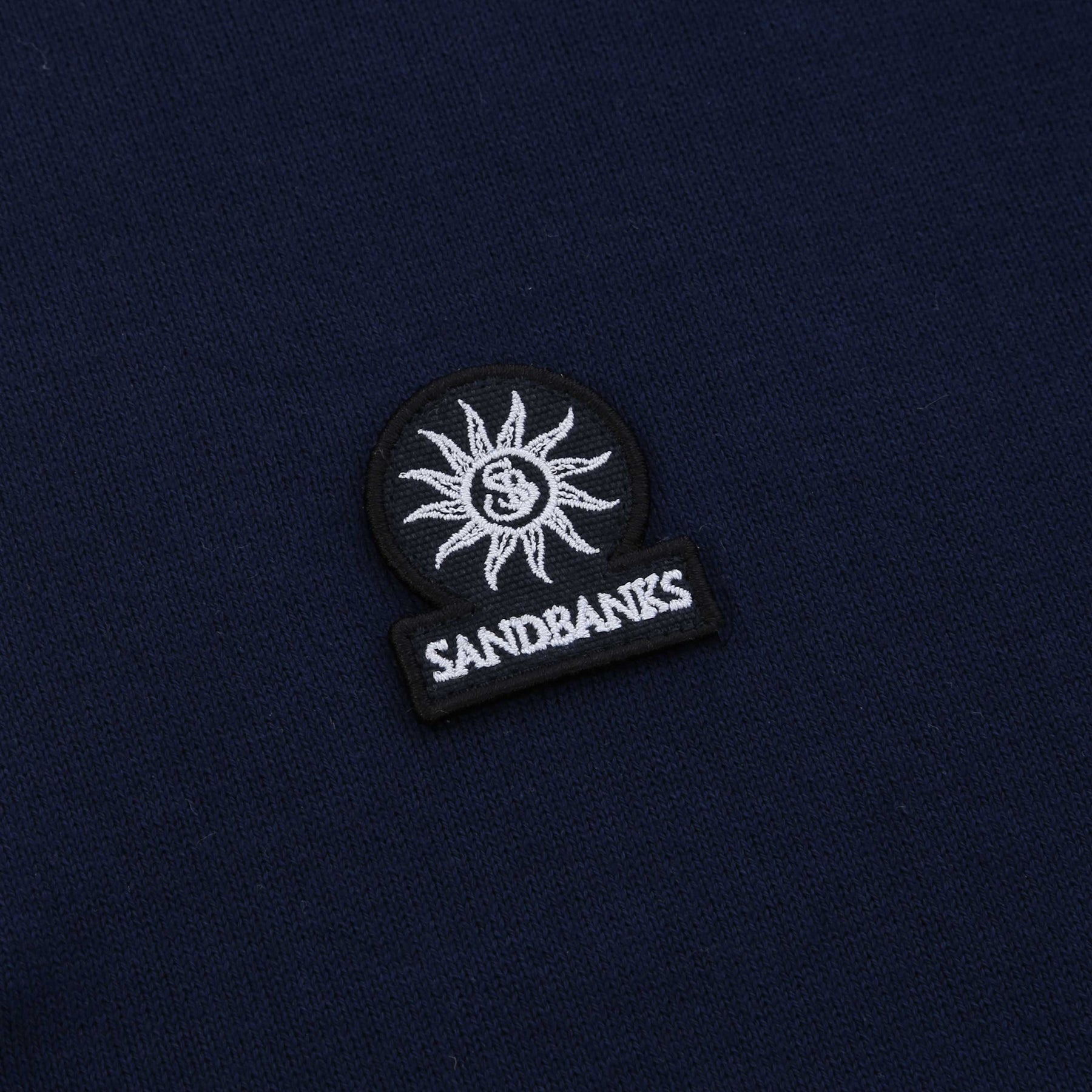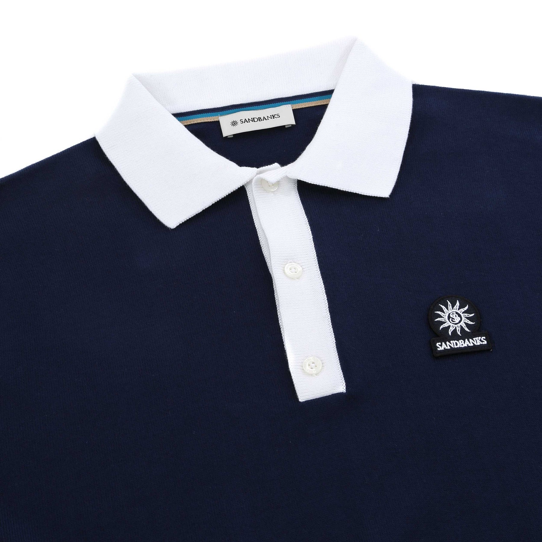 Sandbanks 3 Button Knitted Polo Shirt in Navy. Knitted polo shirt by Sandbanks. A regular fitting polo shirt with short sleeves. 3 button placket to the polo shirt. Solid contrasting colour collar, cuffs, waistband and placket. Constructed from an organic cotton for a luxurious feel. Plain design polo shirt with a Sandbanks logo badge to the chest.
