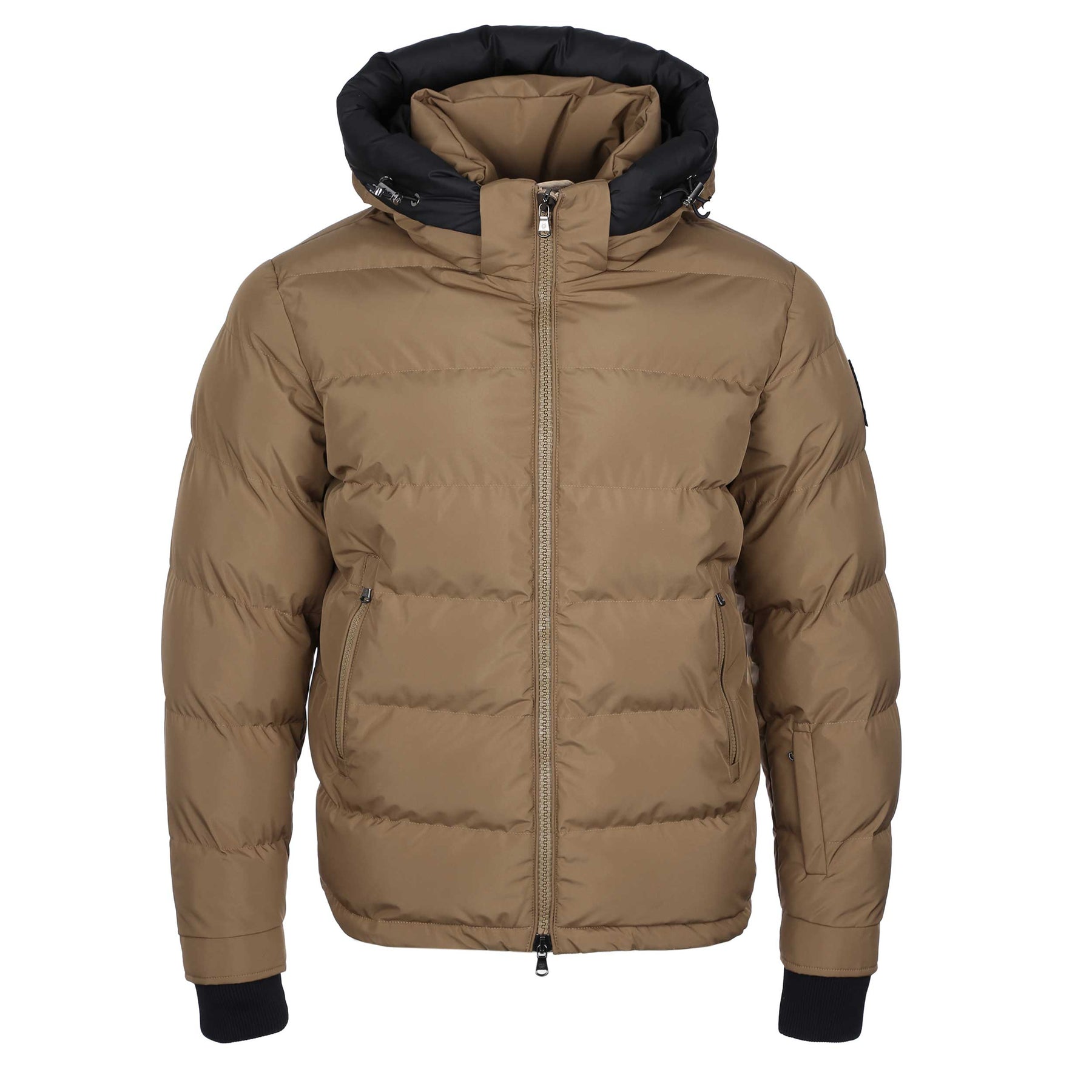 Sandbanks Banks Puffer Jacket in Light Brown. A regular fit puffer jacket by Sandbanks. Two way fastening zip placket to the front. Hood with elasticated drawstrings. Contrasting colour inner and trim to the hood. Two way zipper front pockets. Branding to the inner placket. Concealed ribbed cuffs. Embroidered Sandbanks logo badge to the sleeve.