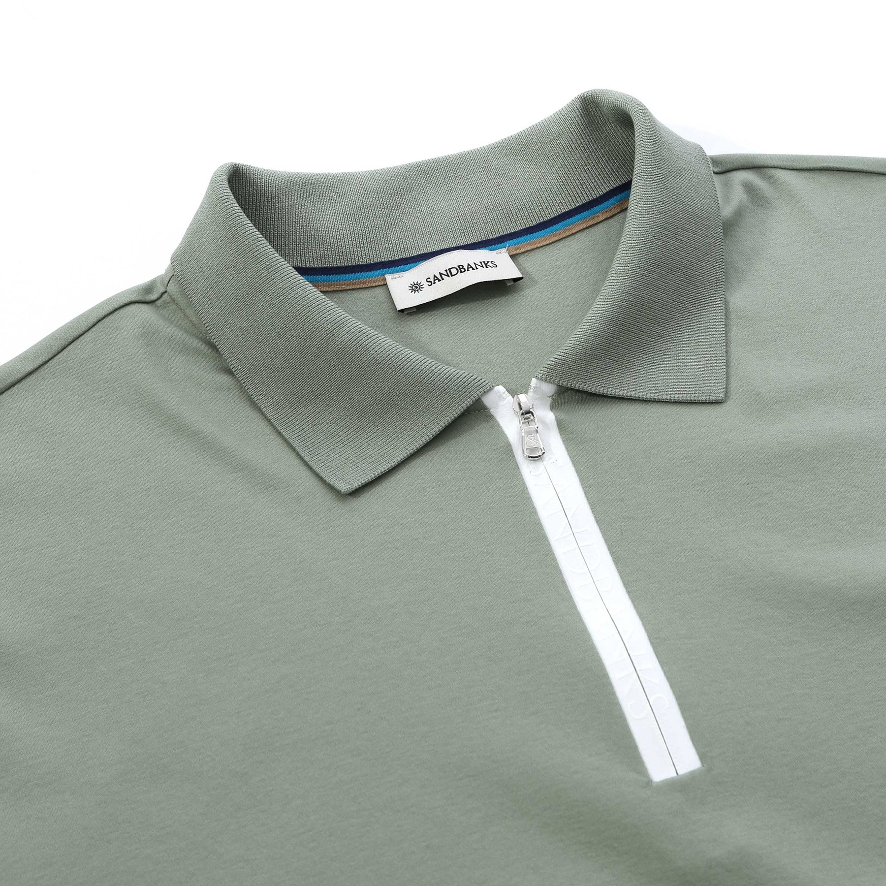 Sandbanks Silicone Zip Polo Shirt in Sage. Polo shirt by Sandbanks. A regular fitting polo shirt with short sleeves. Classic style polo collar with a zip fastening placket. Contrasting colour trim to the cuffs. Constructed from a mercerised cotton for a luxurious feel. Sandbanks rubberised logo to the sleeve.