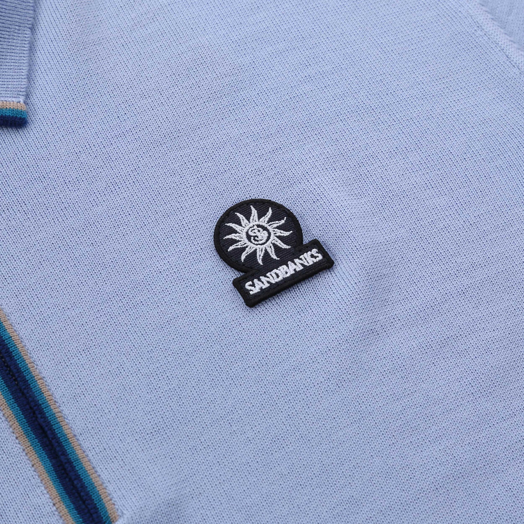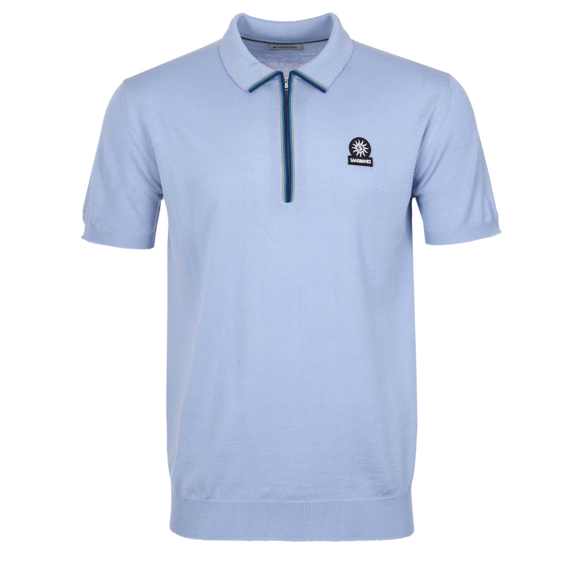 The soft knit construction is complemented by a sleek zip placket, detailed with a subtle striped trim for a modern edge. Finished with the signature Sandbanks badge logo at the chest, it delivers a clean, elevated aesthetic that transitions effortlessly from day to evening.